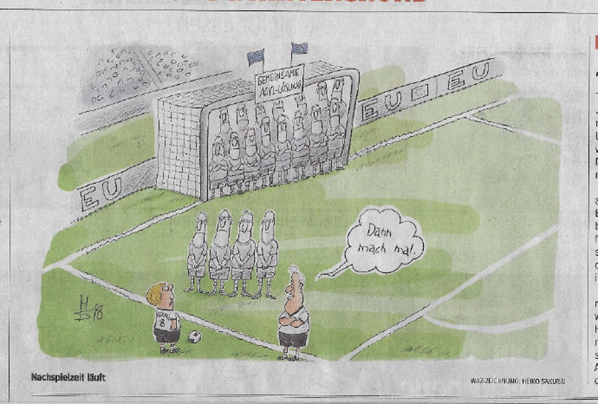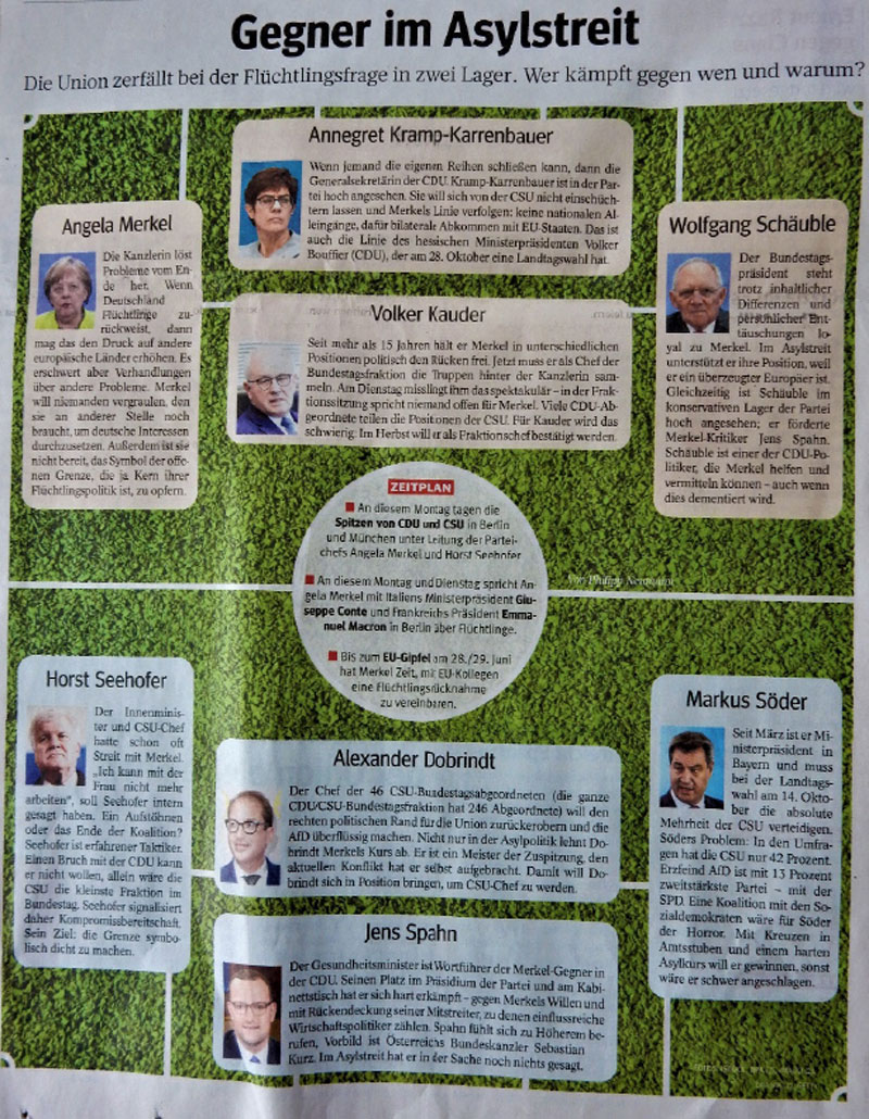 Wie aber sieht dieser Doppelpass zwischen Fußball und Politik in der deutschen Presse aktuell aus?10 Das zurzeit vorherrschende Politikthema ist der die Regierungskoalition infrage stellende Streit zwischen CSU und CDU, in Personen gesprochen zwischen Innenminister Horst Seehofer und Bundeskanzlerin Angela Merkel; ein Streit, der auch in Analogien zum Fußball (und auch wieder zurück) dargestellt wird, wodurch zwei aktuell in der öffentlichen Wahrnehmung wichtige Ereignisse miteinander so kurzgeschlossen werden, dass sie zur Keimzelle einer Gesamtdiagnose der Befindlichkeit Deutschlands werden können.