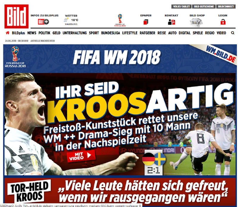 Die Dominanz der Spieler-Charaktere gegenüber nationalstereotypen Zuschreibungen zeigte sich auch nach dem Vorrundensieg Deutschlands gegen Schweden. In der Presse hieß es am nächsten Tag nicht, dass die deutsche Mannschaft ihre nationalen Tugenden wiedergefunden hätte, sondern im Mittelpunkt stand ein einziger Spieler: Toni Kroos. Die Westdeutsche Allgemeine Zeitung schrieb am 25.6.2018: "Deutschland ganz Kroos", und die BILD-Zeitung titelte auf ihrer Webseite (Bild+):