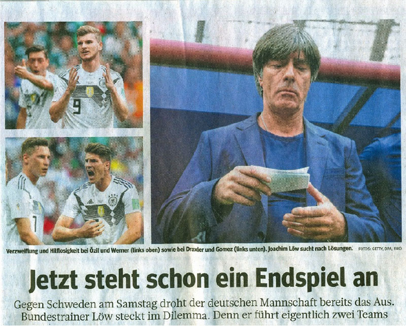Eine solche hat die BILD-Zeitung am 18.6.2018 realisiert, indem sie die Lage der deutschen Automobilindustrie, diejenige der Stabilität der deutschen Politik bzw. Regierung und die Situation des deutschen Fußballs auf das Engste miteinander verknüpft hat: