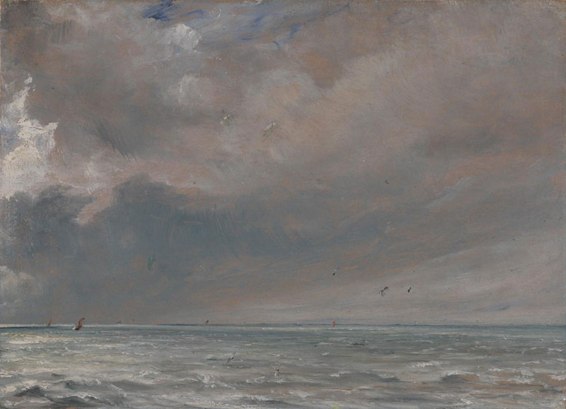 Pas toen de wereld helemaal rond was werd de horizon ontdekt. Vier kunstenaars spreidden in de jaren ’20 van de 19de eeuw de horizon regelrecht tentoon: Jean-Baptiste Corot in 1822 (afb. 11), Caspar David Friedrich deed dat naar alle waarschijnlijkheid in 1826 (afb. 12), terwijl zowel William Turner (afb. 13) als John Constable (afb. 14) zich in 1827 aan dit landschapsmotief waagden. Deze landschappen teren op enkele onopgeloste tegenstrijdigheden. Zo is het opmerkelijk dat de omvattende verte die een horizon veronderstelt, zelf wordt gevat op een eerder klein beeldvlak: de afmetingen variëren tussen 17,5 x 23,8 cm (JC), 18,7 x 26,5 cm (CDF), 23,5 x 31 cm (JBC) en 32,1 x 50,2 cm (WT). Dit handzame formaat was geschikt voor het schilderen in buitenlucht. Nog meer dan het formaat is het het schetsmatige karakter van de tekening dat deze taferelen ervan weerhoudt een definitieve blik te bieden. Met uitzondering van Friedrichs tekening overheerst in geen van deze beelden de horizontale lijn. Telkens zit de horizon ingebed in de specifieke klimatologische omstandigheden die de artiesten ter plaatse aantroffen. Deze atmosfeer werd aangrepen om dit minimale tafereel toch enige diepte te geven. Het contrast in de strook die de horizon uitzet vindt telkens weer zijn gelijke in een andere toets, elders in beeld. Hier snijdt geen evenaar het beeld doormidden. Daarvoor valt het globale opzet van Corot te licht uit. Zoals dat van Constable eerder naar het donkere neigt, anticipeert Turner met een wolk op de onderliggende watermassa. We bekijken dit tafereel, schijnbaar, vanop zee. Enkel bij Corot krijgen we onderaan een minimale suggestie van het strand te zien. Wat er in alle gevallen toe leidt dat het beeld in twee stroken uiteen dreigt te vallen. Zover komt het niet omdat de kunstenaar de middelen aangrijpt om beide op elkaar te betrekken. Hierin gaat Constable vermoedelijk het verst, wiens ‘grijze’ horizon nu eens acuut omslaat in een spierwitte dan weer in een pikzwarte verdichting. Wat we hierdoor in drievoud binnen deze studies aantreffen is een horizon, niet de horizon. De betrachting om tot een vermeende essentie door te dringen wordt in deze landschappen bij voorbaat opgegeven. Zelfs een plaats die je vertrouwd is, waar je leeft of die je reeds herhaaldelijk hebt geschilderd, kan je niet kennen. Het hoogste wat binnen ons bereik valt is het verkennen van een omgeving. Bij uitbreiding kan je je afvragen wat de claim is die de ontdekkingsreiziger uitspreekt wanneer deze een ‘nieuw’ land aan de wereldkaart toevoegt. Wanneer deze zich genoodzaakt ziet om een kust, die telkens aan de getijden onderhevig is, tot een lijn te herleiden.