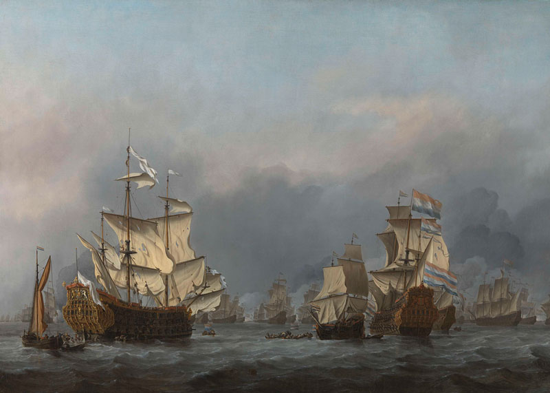 Waar wist de horizon zich al die tijd te verstoppen? Onder andere de 18de-eeuwse haventaferelen (afb. 20) van Claude Joseph Vernet verlenen ons een blik op de favoriete schuilplaatsen van de horizon. Eens je bent uitgekeken op het warme vuur in de voorgrond, wordt de nachtelijke horizon uitgelicht door de koude maan. Althans: dat wat je ervan weerhoudt de horizon te zien. Net wanneer je meent dat je blik de vrije loop krijgt, duikt er wel een haven, een sloep, een schip of een eiland op die deze dieptesprong tijdig ondervangt. Een eeuw eerder dekte een marineschilder als Willem van de Velde de horizon af met galjoenen en fregatten (afb. 21). Een horizon tuurde er soms langsheen. Simon de Vlieger ging hier wellicht het verste in, de klemtoon bleef onverminderd op de schepen liggen.