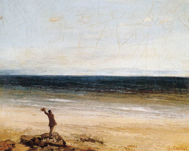 Wie groet de vriendelijke man in Courbets Le Bord de mer à Palavas (1854, afb. 22)? Een geliefde die is uitgevaren, reeds lange tijd uit het gezichtsveld verdwenen, waarbij hij in de onnozele veronderstelling verkeert dat zij op het achtersteven precies hetzelfde doet? Wellicht niet. Deze man salueert de horizon, hem voorgedaan door Géricaults drenkelingen op dat krakkemikkige vaartuig. Al zijn de verschillen met dat doek niet gering: hij staat hier moederziel alleen, veilig op het strand. Maar waar het hier bovenal om gaat is de geaardheid van de horizon; toont deze zich erkentelijk aan het opzet van Friedrich? Dat wordt duidelijk wanneer we de gezichtseinders van Courbet en Géricault op elkaar betrekken, waarbij het stipje aan de horizon niet langer de Argus uitmaakt, het zusterschip van de Medusa dat de onfortuinlijke drenkelingen tegemoet spoedt, maar wel Courbets vriendelijke man op het strand. Nog steeds eenzaam en alleen. Voor de zeelieden van Géricault is niet alles eender, uitgerekend dat zou de totale ontreddering betekenen, deze horizon bezit intensiteitsverschillen: dat stipje! ‘Hou moed! Hij heeft ons gezien!’ Tumult, op een al wankel vlot, dat de man op het strand evenwel geheel ontgaat. Tevergeefs gaan hun gebaren in de golven op. De horizon die hij overziet is niet aan contrasten onderhevig. Misschien, het is maar een gok, is de vriendelijke man van Courbet een generaal op rust. Overschouwen doen we immers slechts onder zeer specifieke omstandigheden; in het geval van troepen, in uniform en daarmee zonder aanwijsbaar verschil, of nadien; op het slagveld – wat meteen aangeeft dat aanschouwen gepaard gaat met, wie weet zelfs gebaad is bij, een specifiek soort onverschilligheid. Je overschouwt een horizon, de horizon aanschouw je.