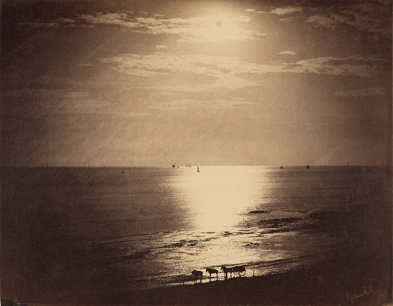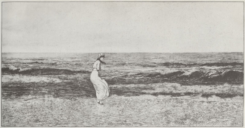 Geen wolkje aan de lucht. De horizon die ons hier bij herhaling door Courbet, Whistler (afb. 23), Klinger (afb. 24) en Gérôme (afb. 25) wordt voorgeschoteld is uniform. Niet enkel betreft het een identieke pasvorm die van schilderij op schilderij wordt overgedragen, deze inwisselbaarheid wordt maar mogelijk gemaakt doordat ieder element van deze horizon aan elkaar gelijk is. Anders dan Corot, Constable en Turner anticiperen deze schilders hierop door een personage in de voorgrond te posteren. Het verschenen strand introduceert een derde strook, naast de zee en de hemel die door horizon wordt gescheiden. Dit gestalte, zelfs in het voorkomen van een luierende leeuw (Gérôme), beslecht de lijn tussen kust en zee, maar laat de horizon ongemoeid. In dit opzet, dat voortborduurt op de verworvenheden van Friedrich, komt de klemtoon die eerder nog op de horizon lag nu op het personage te liggen. Zonder de horizon te weerleggen, betekent deze vrouw, man of katachtige de gelijke van de horizon; een horizon waarin ieder aan elkaar gelijk is, schakelt bij uitbreiding alles binnen het beeld aan de horizon gelijk. Hiermee lost de horizon als omgangsvorm op binnen het opzet van het overzien (afb. 26, 27, 28).