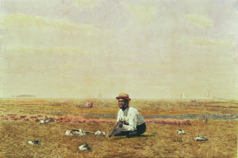 Thomas Eakins’ Pushing for Rail (afb. 29) toont aan dat de omgang met de horizon drastisch wijzigt zodra je het evidente zicht op zee verruilt voor een uitzicht op een vlakte. Alvorens we daadwerkelijk op het vasteland overstappen, treffen we in dit bijzondere doek een overgangsfase aan die klaarblijkelijk gunstige picturale mogelijkheden aanbood. Wat er aanvankelijk uitziet als een jachtpartij op het vasteland, betreft bij nader inzien het doorwaden van moerasland aan de oevers van de Delaware. Terwijl de bootjes in het hoge riet verdwijnen, wordt de horizon doorpriemd door de smalle loop van een geweer en de roeiriemen van de drijvers. Het naaldvormige onderbreekt nauwelijks de panoramische lijn, deze sprieten accentueren deze veeleer. Het opzet van Whistling for Plover (afb. 30) is gelijkaardig: laag tegen de grond aangedrukt, terwijl zijn rieten hoedje optisch in de heldere hemel opgaat, ontkomt een jager aan het doorbreken van de horizon.