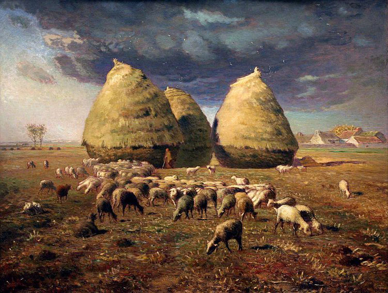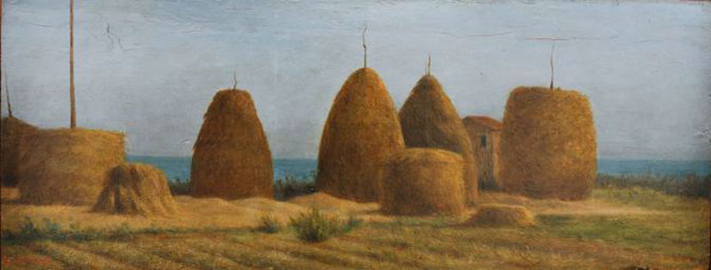 Jean-Francois Millet vestigt de aandacht definitief op het betreedbare vlakke land (afb. 31). Al in 1857 leverde hij met zijn Des Glaneuses (afb. 32) een van de hoekstenen van de 19de-eeuwse schilderkunst af, een van de meest bijzondere omgangsvormen in relatie tot de horizon: in de hoedanigheid van drie vrouwen die de aren lezen. In het ontduiken van de horizon vindt hij in het voorovergebogen oprapen van teeltoverschotten de uitgelezen houding. De horizon, die minder ongeschonden is dan de exemplaren die we eerder aantroffen, laat zich ondertussen met andere ontkiemende omgangsvormen in: de hooimijters in de achtergrond worden in enkele van zijn latere doeken verzelfstandigd (afb. 33). Deze omgangsvorm met de horizon werden haast gelijktijdig behandeld in de kunst van de Macchiaioli, een groep Italiaanse landschapsschilders. Rechtstreeks speelt Raffaello Sernesi in zijn Pagliai a Castiglioncello (1865, afb. 34) cilinders en kegels tegen een zeezicht uit. Daarmee werpt hij tevens een blik vooruit op het eigenaardige karakter van de horizon in het oeuvre van zijn landgenoot Giorgio Morandi (afb. 35), zoals die dat bijna honderd jaar later zou uiteenzetten.