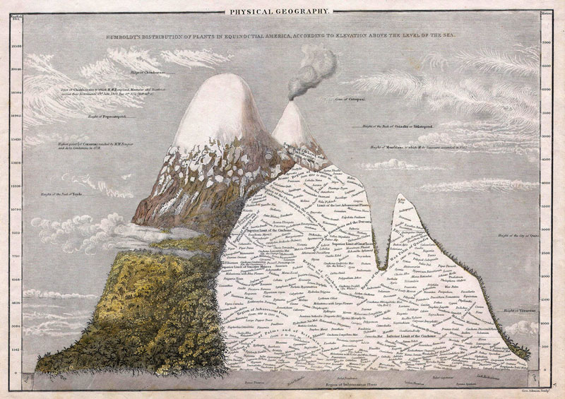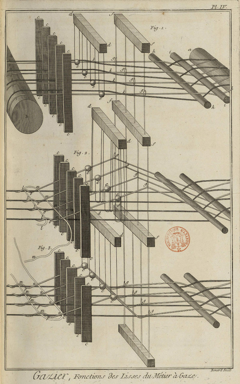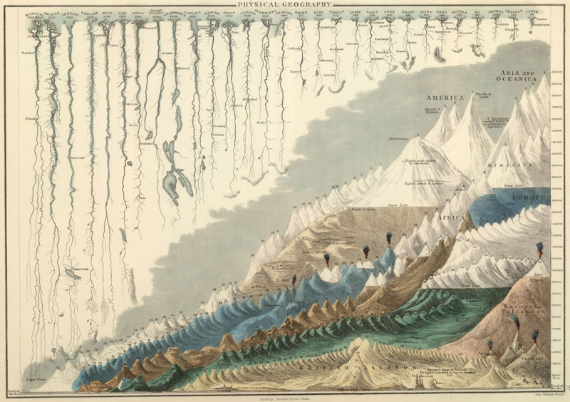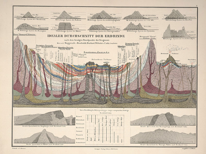 Terwijl Newton reeds het groter geheel tussentijds op overtuigende wijze had uitgelicht, ontfermde Dmitri Mendelejev zich in 1869 over een glashelder overzicht van de chemische elementen. Het verkregen panorama dat gaandeweg over alle mogelijke deelgebieden heen uitklaarde, dreigde andermaal te verzanden in een onoverzichtelijke bedoeling. Onder de niet mis te verstane titel, Kosmos – Entwurf einer physischen Weltbeschreibung (1845-1862, afb. 3, 4, 5), trok Alexander von Humboldt hiertegen in verweer: werkelijk alles tracht hij in beeld te krijgen. Liefst datgene wat zich in zijn onoverzichtelijkheid aan beeldvorming onttrekt: woestijnen, rivierlopen en bergketens worden respectievelijk volgens uitgestrektheid, lengte en hoogte gerangschikt. Daarmee plaatste hij zich in de traditie van de Encyclopédie, een van de voornaamste projecten onder leiding van Diderot en d’Alembert, waar de Verlichting in culmineerde en waarin een overzicht van alle beschikbare kennis wordt aangeboden. Helpt een landkaart je verder in de concrete aanduiding van Acapulco, Manilla of Tripoli, dan wijden de gravures in de Encyclopedie je in in de geheimen van het alledaagse (afb. 6, 7, 8). Zoals een landkaart gespaard is van hiërarchie – het ene continent is niet ‘beter’ of ‘hoger’ dan het andere –, zo geeft de alfabetische/thematische inrichting van een encyclopedie aan dat dit voor alle particuliere onderwerpen het geval is, variërend van chirurgie, het gieten van klokken, het delven van grondstoffen in de mijnbouw tot het breien van visnetten.