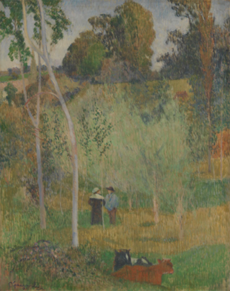 Dat ‘zwenken’ lijkt trouwens ook een centrale rol te spelen: bemerk hoe alle focuspunten gedecentreerd zijn opgesteld, waardoor onze ogen als vanzelf tussen de verschillende beeldelementen heen en weer gaan. Gauguin navigeert de blik van de toeschouwer als was het een ruimtetuig dat tussen de zwaartekrachtsvelden van verschillende hemellichamen geloodst wordt, maar nergens ooit definitief landt. Onze aandacht rust nog niet op de man en vrouw of hij wordt al afgebogen naar het helwit van de oprijzende boomstam, richting het blauw in de hoogte om dan weer naar de koeien beneden te zakken. We bewegen ons kijkend doorheen dit schilderij zoals iemand die dwars doorheen een draaiende carrousel probeert te lopen.