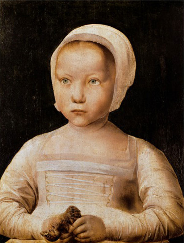 Mädchen mit totem Vogel ist mehrfach technisch untersucht worden, seitdem es 1922 in den Besitz des Brüsseler Museums übergegangen war, aus einer aristokratischen Privatsammlung ohne genauere Angaben zur Herkunft. Über 20 Prozent des Bildes stammen nicht aus dem 16. Jahrhundert. Und rechts hinter dem Mädchenkopf befand sich die Darstellung eines weiteren Kopfes, die aber übermalt worden ist. Soviel ist deutlich. Nun aber beginnen die Schwierigkeiten. Zum einen: Der Maler hat selbst bereits Korrekturen am Bild vorgenommen. Lagen wurden aufgetragen, ohne sich mit anderen zu mischen. Von gleicher Hand? Einem Mitarbeiter? Späteren Künstlern? Wurde das Bild im 19. Jahrhundert romantisiert, sprich von anderen Teilen gelöst, isoliert, und der ursprünglich grünliche Hintergrund dunkel übermalt? Oder nahm der Maler im 16. Jahrhundert bereits ein altes Werk zur Hand und übermalte den Kopf rechts hinter dem des Mädchens, zugunsten eines neuen Bildes? Der Vogel, darin sind sich alle Experten einig, ist original. Ebenso die Haltung des Mädchens. Auch die Schatten am rechten Ärmel, von denen aus ersichtlich wird, dass Kopfwendung und Blickrichtung korrespondiert haben müssen, selbst wenn die Iris in den Augen des Kindes nachgemalt oder gar betont worden ist. Handelt es sich um ein adeliges Kind, dem ein Portrait gegönnt wurde? Kein Schmuck weist darauf hin. Es scheint ein Kind aus wohlhabendem, bürgerlichem Haus zu sein, Sinnbild mehr als Individuum, ohne Vermerk seines Namens, wie bisweilen in flämischen Gemälden toter Kinder jener Zeit.