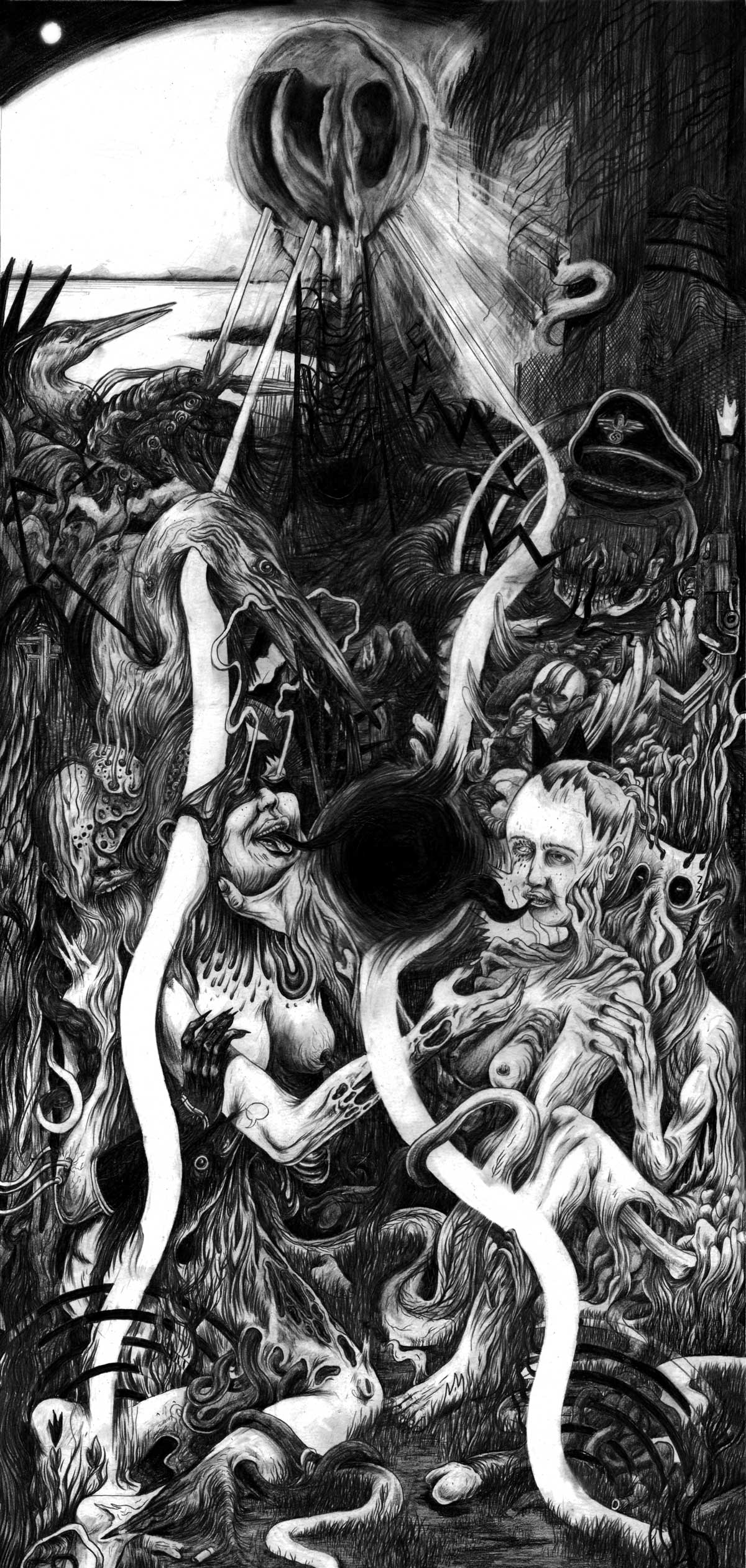 Borne follows the scavenger Rachel during a few months of her precarious life in a post-apocalyptic cityscape full of biotechnological creatures left over by the now-derelict “Company.” The parameters of Rachel’s existence are, in the course of the novel, largely determined by two monstrous beings: Borne and Mord. Borne begins as biotech loot and becomes something close to Rachel’s child; Mord is the giant, flying bear who torments the city. Rachel’s fear of Mord varies in depth and register—from dread via revulsion or fascination, to respect, and even humor—and she uses a wide range of similes and metaphors to describe him: “a murderer light as a dandelion seed”; a “behemoth”;12 “a destroyer [military vessel]”;13 “a large, irregular globe of dark brown”; “an eclipse or a chemical cloud or my death”; “a living dreadnaught”;14 “the end of the world”; “the greater darkness,” and yet “the purest reflection of the city”;15 “God of Nothing.”16