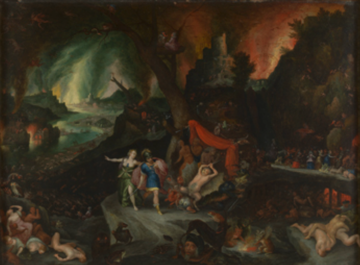 Na een vijftal verwensingen en de daarbij horende weesgegroetjes viel mijn oog op een klein werk van slechts een voet breed en een hand hoog. “Aeneas in de hel” door Jan I en Jan II Brueghel verzocht mijn vrome attentie en deed mij glimlachen. Niet omwille van de meesterlijke handen, academische stijl of historische waarde, maar eerder omwille van zijn lachwekkende titel. ‘Lachwekkend?’, denkt u, moeder. Sta mij toe dit nader te verklaren.