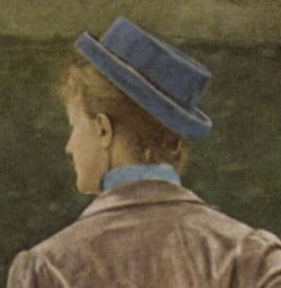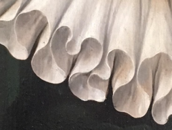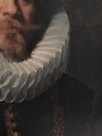 Een detail dat mij bijna ontglipt was is het stukje linnen aan de binnenkant van de kraag dat zich in de nek van de dame situeert. Dit is het boordje aan de bovenkant van de cilinder waar de plooien aan vastgenaaid zijn. Het lijkt zijn best te doen om uit de donkerte en benauwdheid van de kin te glippen. Dit is enkel gelukt op de plaats waar het stofje opgelicht verschijnt, of moet ik zeggen opgelucht?