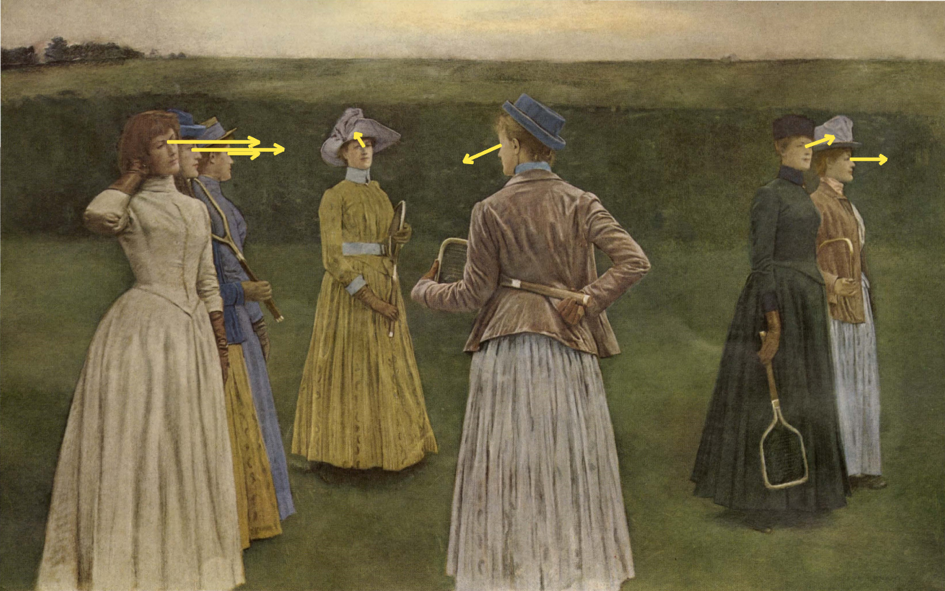 Naast de blikrichtingen benadrukken ook de richtingen van de rackets het gebrek aan contact tussen de personages (afbeelding 3). Het tennisracket van het personage dat de toeschouwer de rug toekeert, doorklieft een mogelijk contact tussen de versies in het blauw en in het geel. De andere rackets wijzen allemaal weg van het centrum en benadrukken zo de desinteresse van de personages in elkaar.