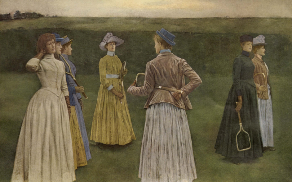 Verder verbinden ook de klederdracht en de kleuren de personages. Allemaal dragen ze gelijkaardige kleren: hoeden, een hoge nekkraag, lange jurken en handschoenen. Enkel de Marguerite links heeft geen hoed. De kleuren van de kleding bestaan volledig uit blauw, geel, bruin en beige en zorgen zo voor samenhang tussen de personages. Ook zijn deze kleuren zo verdeeld dat de ogen van de toeschouwer heen en weer springen tussen de figuren en op deze manier het statische effect van de verticalen in de houdingen tegenwerken. Zo verbinden de kleuren de figuren en maken ze van het werk een geheel. Een opvallende afwijking in het kleurenschema is de figuur in het zwart. Die zorgt ervoor dat de onbestemdheid van het grijsgroene in dit werk omslaat in een licht ongemakkelijk gevoel. De zwarte kledij van dit personage staat in sterk contrast met de Marguerite in het wit aan de linkerkant.