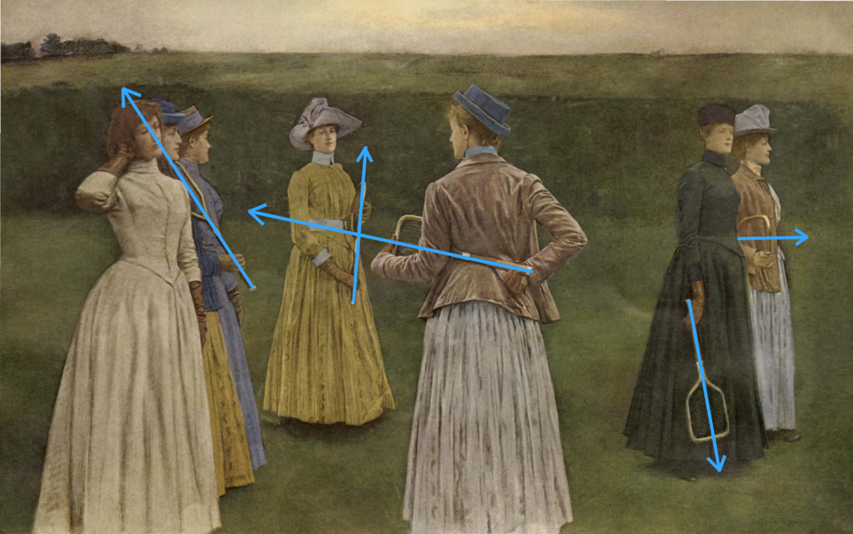 De mogelijkheid op enig contact tussen de vrouwen wordt ten derde ook verbroken door de posities en houdingen van de personages. De grootste splitsing gebeurt tussen de Marguerite met de rug naar de toeschouwer gekeerd en de twee rechts die weglopen van het tafereel. Deze twee volgen de leesrichting van links naar rechts en maken hun uittocht uit de scène op die manier definitief. De verticalen van de jurken staan sterk in contrast met de horizontale die door de hoofden loopt en de horizonlijn. Ze maken het werk zeer statisch en zorgen ervoor dat de figuren geïsoleerd staan. De kleding, die de figuren bijna volledig bedekt, zorgt opnieuw voor een isolerend gevoel.