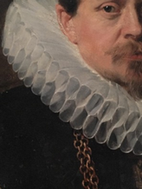Er zijn verschillende manieren waarop we een plooikraag kunnen benoemen. Dit geldt eveneens voor de uitbeelding ervan. De afgebeelde kraag die we hiernaast zien wordt gedragen door Jacob Van der Gheenste, schepen en raadsman van de stad Brugge. Het beeld is geschilderd door Pieter Pourbus omstreeks 1583. Tussen alle kragen die gedragen worden in het museum gaat mijn voorkeur uit naar deze. Hier voel ik een speelsheid die bij de andere kragen ontbreekt. De plooien nemen immers niet allemaal dezelfde perfecte bochten en tussen deze plooien ontstaan er beweeglijke kronkels. Er is geen transparantie van het materiaal, wat maakt dat de kraag veel meer aanwezig is als object. Je voelt dat hij zwaarder is en strak aangespannen moet zijn, wil hij niet slapjes op de schouders hangen. Het strenge gezicht van de afgebeelde man maakt het contrast met de speelse kraag des te groter. Het doet ook ietwat afbreuk aan de sensualiteit van de kraag. Als ik kijk naar de detailfoto, kan ik de lijnen van de kronkels lang blijven volgen. De schakeringen van licht naar donker zijn wederom fascinerend om te zien door hun subtiliteit en tederheid. Wanneer ik echter het schilderij in zijn geheel bekijk, kan ik niet anders dan afgeleid worden door het portret.