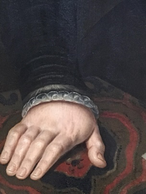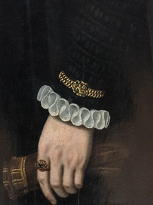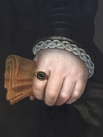 Een ander aspect dat mij laat blijven kijken is de schaduw die het kraagje achterlaat op de hand van de vrouw. Die zorgt er immers voor dat de hand een volledig apart onderdeel is, los van de rest van het lichaam. Bij een mouw zie je de pols stilaan verdwijnen en verbeeld je je dat die verder doorloopt in een arm tot aan de schouder en zo aan het gehele lichaam is gehecht. Op dit schilderij zie ik de hand eerder als een levenloos object dan een lichaamsdeel waar bloed door stroomt, dit komt mede door de bleke huidskleur en een gebrek aan handeling. De ringen die de vrouw draagt zijn daarentegen zeer gedetailleerd en met warme kleuren geschilderd, ze lijken meer te leven dan hetgeen ze omringen. Deze hyperrealistische weergave van de ringen zorgt voor een groot contrast met de doffe hand die hierdoor meer verdwijnt naar de achtergrond. Ook de plooien van het kraagje dragen hieraan bij, hun gevoeligheid en levendigheid overheersen de hand. De overmatige belangstelling voor de ringen en het kraagje kan ook duiden op het belang van status. In de materialen zit zoveel detaillering en aandacht voor kwaliteit en uitstraling dat de persoon in kwestie eerder een paspop lijkt voor deze materialen. Tegelijkertijd bleef het uiteraard wel belangrijk wie deze stoffen, sieraden en plooikragen überhaupt kon dragen.