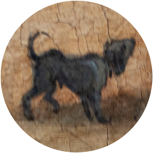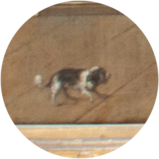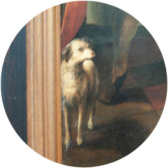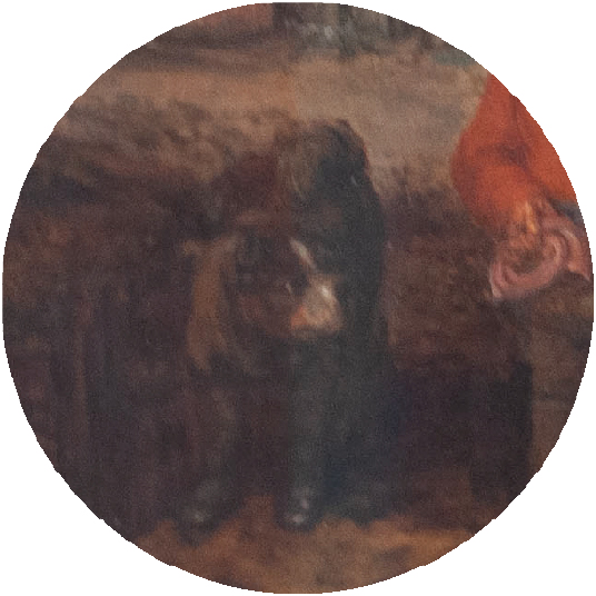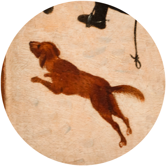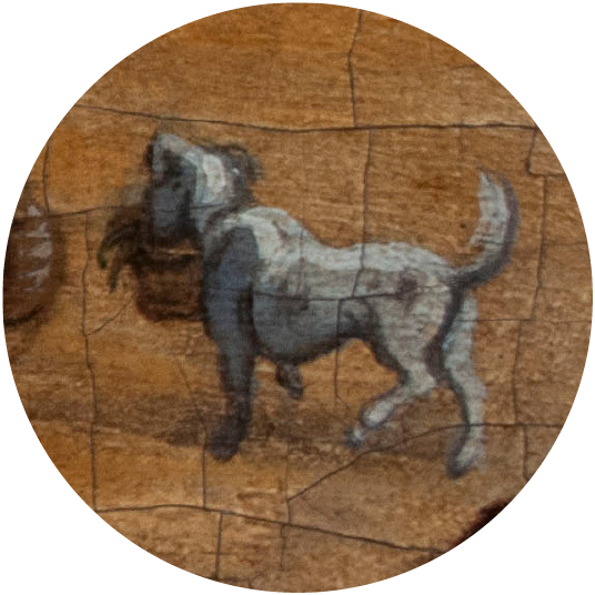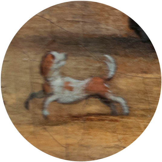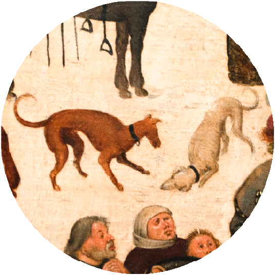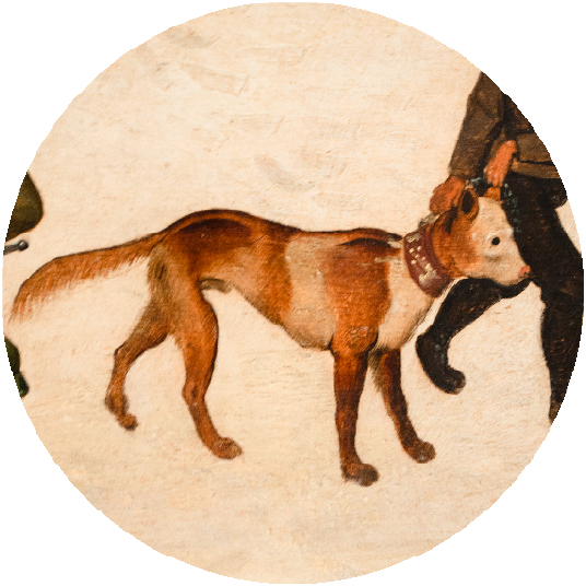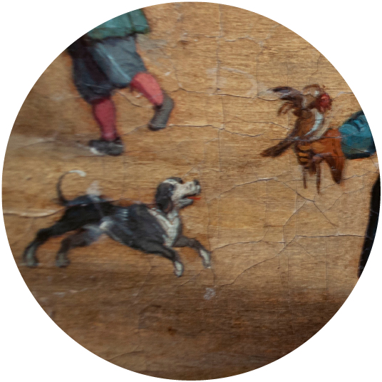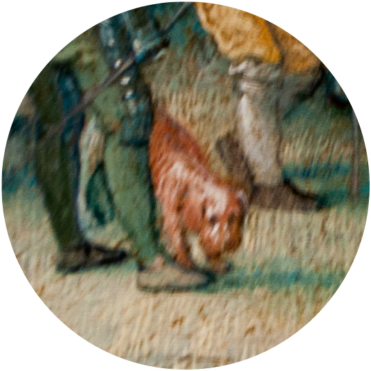De zingende man is opnieuw een stereotiep. Hij heft de kan, misschien al proostend of dansend op de tonen van de doedelzak. En uiteraard is hij met zijn pet aan het zwaaien. Deze man is voor mij de grote feestganger van het werk. Diegene die de show moet stelen. Hij is dan ook de enige die zich zo groot maakt (met beide armen). Desondanks is hij alleen in zijn enthousiasme. Alle anderen, met uitzondering van de kotser en de baby, hebben de ogen op de koning gericht. De man die in alle uitbundigheid de aandacht tracht op te eisen viert in eenzaamheid. Ik vind hem een triest figuur. Is het toevallig dat net hij aan de hond gekoppeld is? De hongerig bedelende hond die om aandacht smeekt van de man die het te druk heeft met in feite net dezelfde bezigheid. De hond en de zingende man zijn samen voor eeuwig alleen. Dit zou een wrangere, en daarmee voor dit werk misschien interessantere, nasmaak kunnen afdwingen, ware het niet dat deze tragedie bijna volledig verdwijnt in de komische sfeer.
