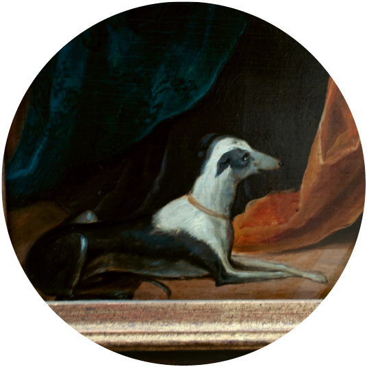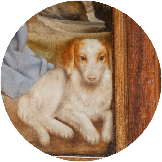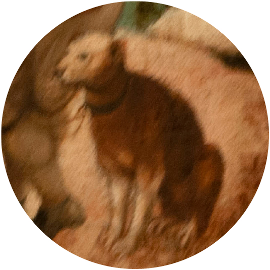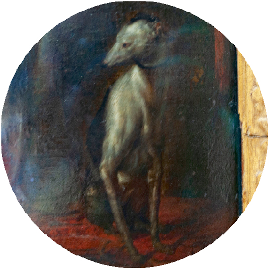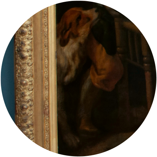 Aan de andere kant van de kamer hangt iemand van wie niemand de naam nog weet. Ze is misschien een Lavinia, of een Angelica. Als je maar genoeg namen opnoemt, zit de juiste er wel tussen. Ze draagt een witte jurk en een witte sjaal. Haar haar is rossig. Ze lijkt licht tegen de donkere achtergrond. Naast haar portret staat een zuil, en voor de zuil een vrouw met even rossig haar, een wit kleed en een witte sjaal door haar haar.
