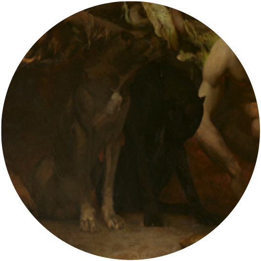 Ze zitten in een kamer, het is hun atelier. Zeven van hen schilderen, de achtste poseert. Hercules, dat is wie ze voorstelt. Een leeuw is over haar heen gedrapeerd; een knuppel die haar fragiele lichaam niet dragen kan hangt met touwen aan het plafond. De muil van de leeuw ligt rond haar hoofd. Het beest lijkt haar op te eten. Zij kijkt ons licht ongemakkelijk lachend aan, onschuldig. Ze draagt een doorschijnende broek, geen slipje, geen blouse. We zullen haar Hercules noemen. Hercules wordt omringd door negen schilderessen, twee van hen zijn schilderijen op de muur, ovaalvormig, dicht tegen het plafond. Een van hen lacht naar ons.