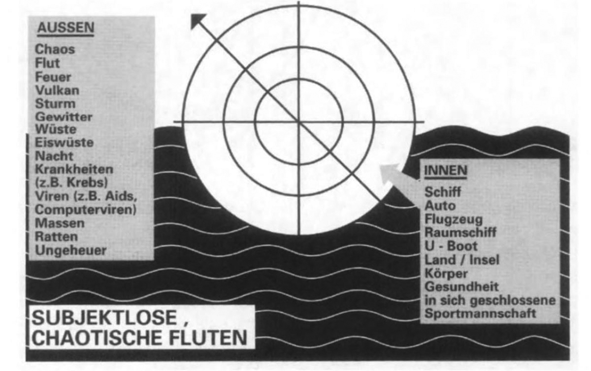 Das Sysykoll stabilisiert dabei nicht nur ‘das Eigene’, sondern zieht auch eine symbolische Grenze zum ‘Anderen’: Das gesellschaftliche Innen verkörperlicht sich z.B. als ‘unsere Fußball-Nationalmannschaft’ (die pars pro toto für das Land stehe), ‘unser Auto’ (dieses Kollektivsymbol ist im Autoland Deutschland von besonderer Bedeutung) oder ‘unser Schiff’ bzw. ‘wir im U-Boot’. In diesen Vehikeln können ‘wir’ ‘uns’ sicher und stabil ‘im Fremden’ bewegen, das oft als flüssig oder unbeherrschbar imaginiert wird (‘Natur’, ‘Meer’, ‘Flut’, ‘Gewitter’‘ ‘Chaos’, ‘Feuer’, ‘Virus’). Diskurse des Rassismus, die mit der Dichotomie ‘Eigenes’ vs. ‘Fremdes’ operieren, bedienen sich oft dieses Kollektivsymbol-Arsenals.