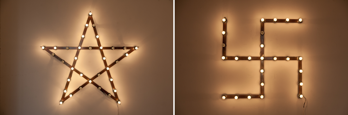 The central symbol of the entire exposition is the object «Alpha and Omega», where the alpha is the five-pointed star, and the omega is the swastika. If we consider these two components as mirrors of one another, then we can see how the swastika turns into the last letter of the Latin alphabet (approx. 3 ). Thus it transmits from one era to another, through the symbol of the beginning and end of all things.