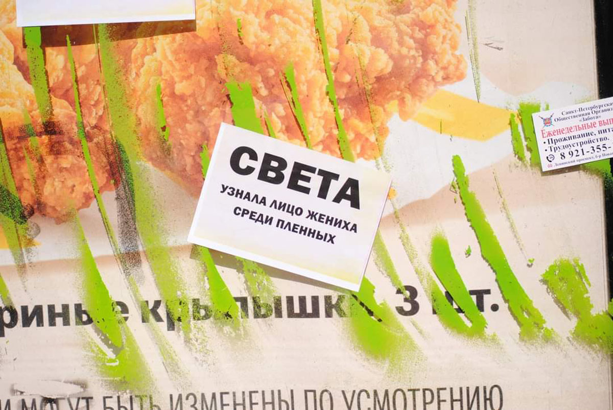 Another protest action is connected with a sensitive topic, illegal prostitution in Russia. In St. Petersburg bright stickers with women’s names and phone numbers are omnipresent at bus stops and on billboards.