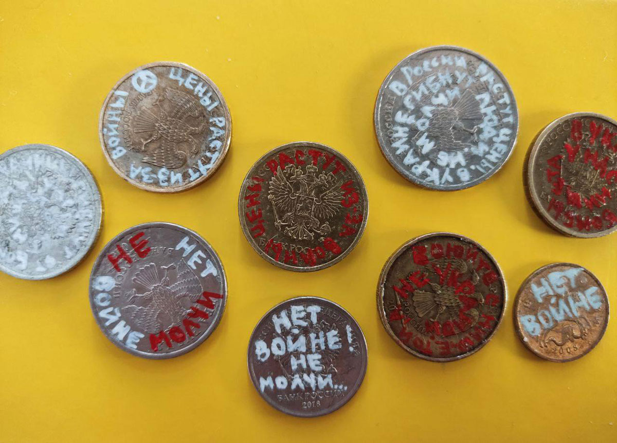 The most active protest group is “Feminist anti-war resistance”. In their Telegram channel they immediately began to propose alternative forms of opposition, such as crying in the subway or in public space, signing banknotes and coins with anti-war statements, printing and sticking “price tags” on products in stores. On these “price tags” written numbers are visible; next to them, instead of the name of the products, there are inscriptions such as “I’ve had no connection with my sister from Ukraine for 8 days, I don’t know how she’s doing, stop the war”, “Russian troops destroyed 80% of the city of Mariupol, what for?”