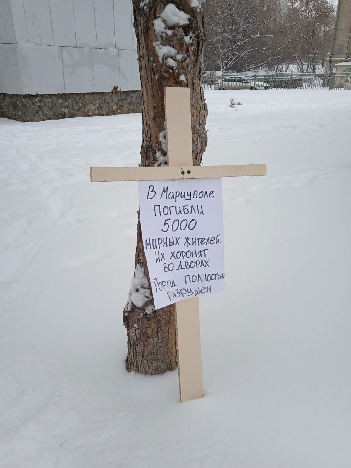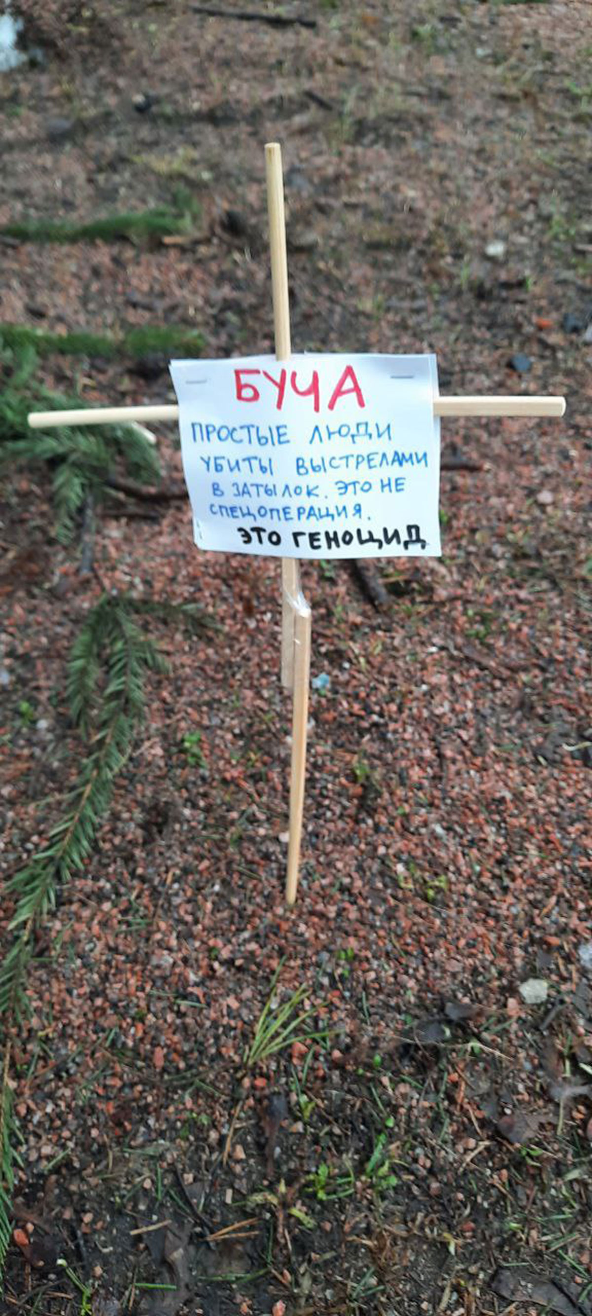 By the end of March, evidence from Mariupol that the dead were buried in courtyards, next to playgrounds, triggered a new activist intervention in public space. The action was called “Mariupol 5000”, corresponding with the number of dead civilians reported. Resistance members set up crosses in urban environments with inscriptions such as “Mariupol. Thousands of dead. They are buried in courtyards. The city is completely destroyed”. In recent days, more and more crosses like these have appeared in different Russian cities. On April 3, when the whole world learned about the massacre in Bucha, new crosses appeared with the inscription: “Bucha. Ordinary people were shot in the back of the head. This is not a special operation. This is genocide.”