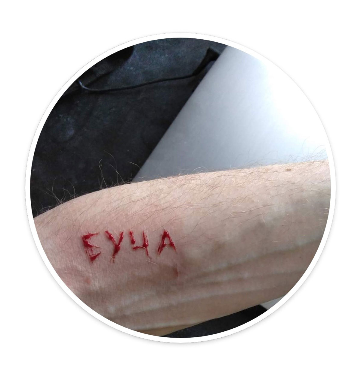 The testimonies of Bucha and other cities in the Kiev region have shocked people. A few days ago I noticed that a Facebook friend of mine published a new profile picture: he had carved the word Bucha on his arm with a blade. Two more photos of people who made the same gesture appeared in the comments. I interpret this gesture as a representation of pain when words cannot express it.
