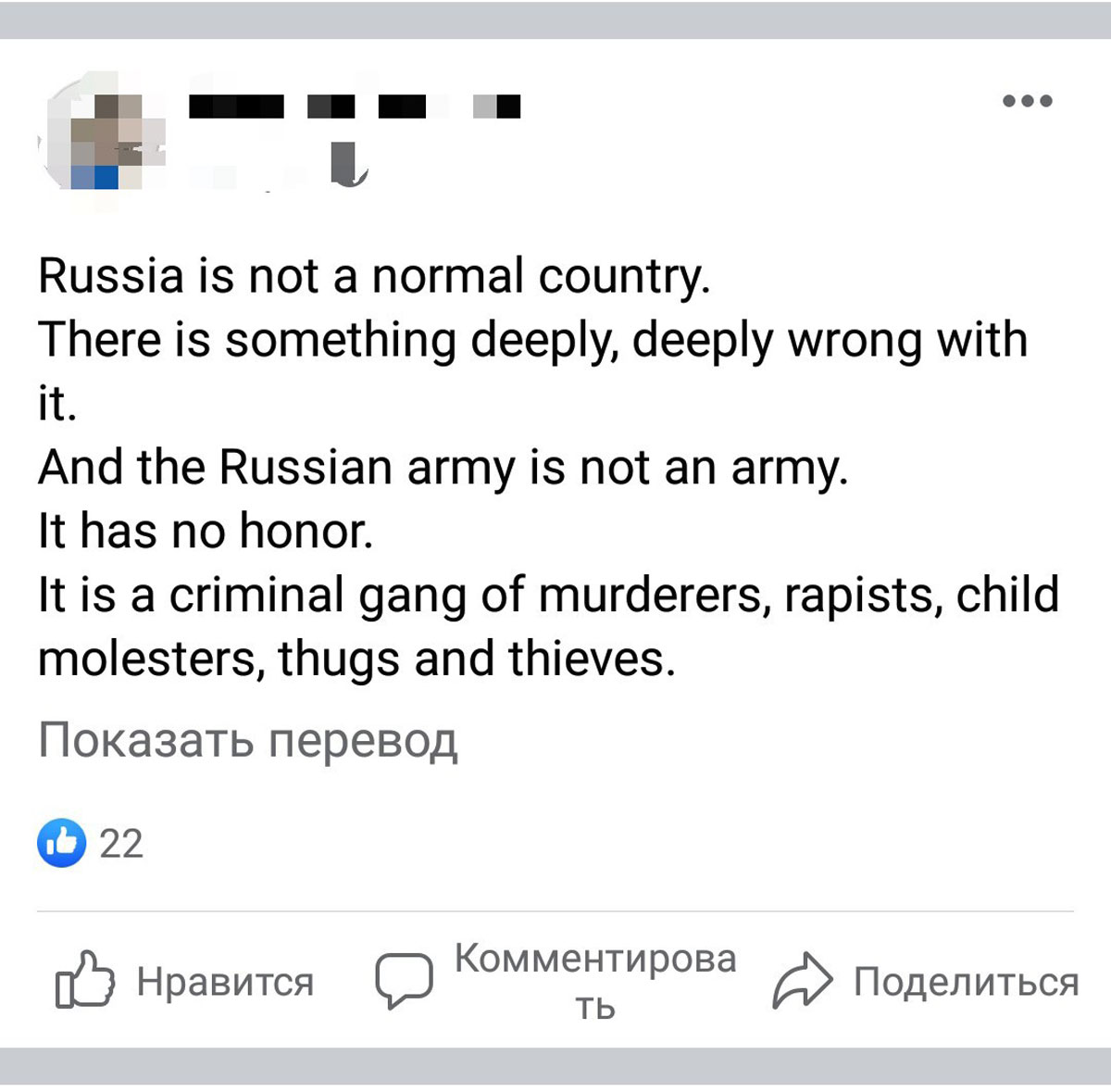 I saw this post from a Facebook friend two weeks ago and I keep thinking what exactly is “deeply, deeply wrong”. I don’t want to think about the Russian army, I can’t imagine how an army can be normal at all. I want to analyze what is wrong with the Russians, because there has been something wrong for a very long time.