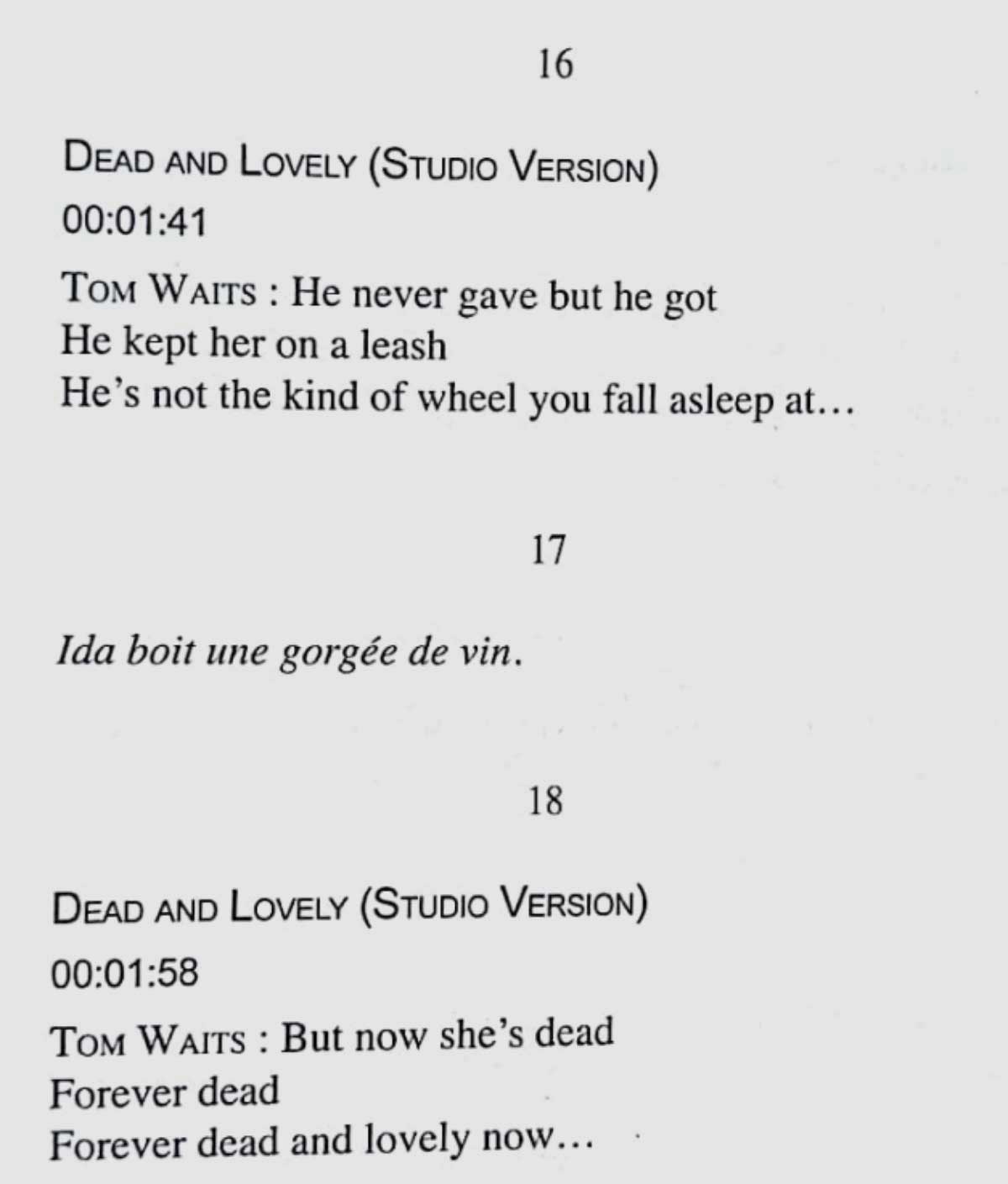 Rather than describing the new technologies Ida is using, Peyrade thus expresses them. She distorts their visual and audiovisual properties with writing strategies that verbalise them and make them readable. She even renders Ida’s synchronous actions through the sequencing of the play. Indeed, she indicates Ida is listening to music while smoking and surfing by isolating and transcribing passages of the song, and by specifying the timing of the written excerpts to evoke the progression of the song despite the insertion of Ida’s other actions: