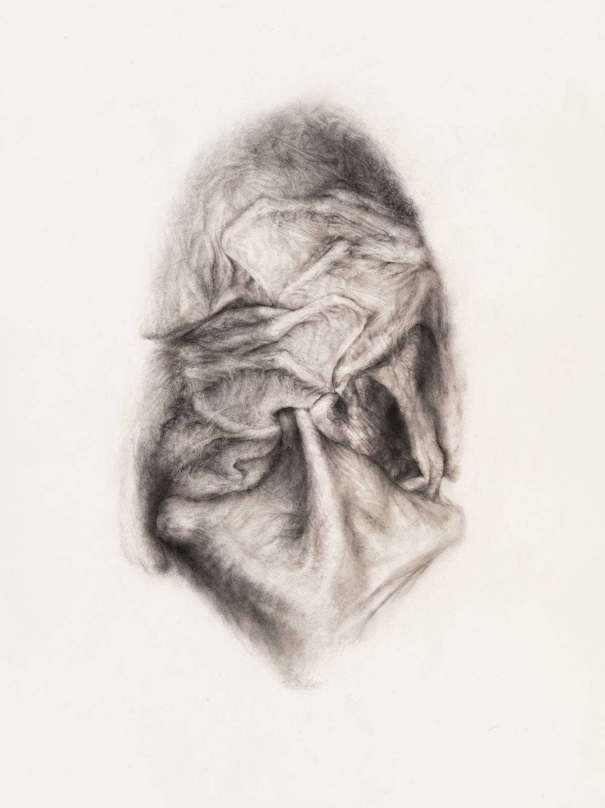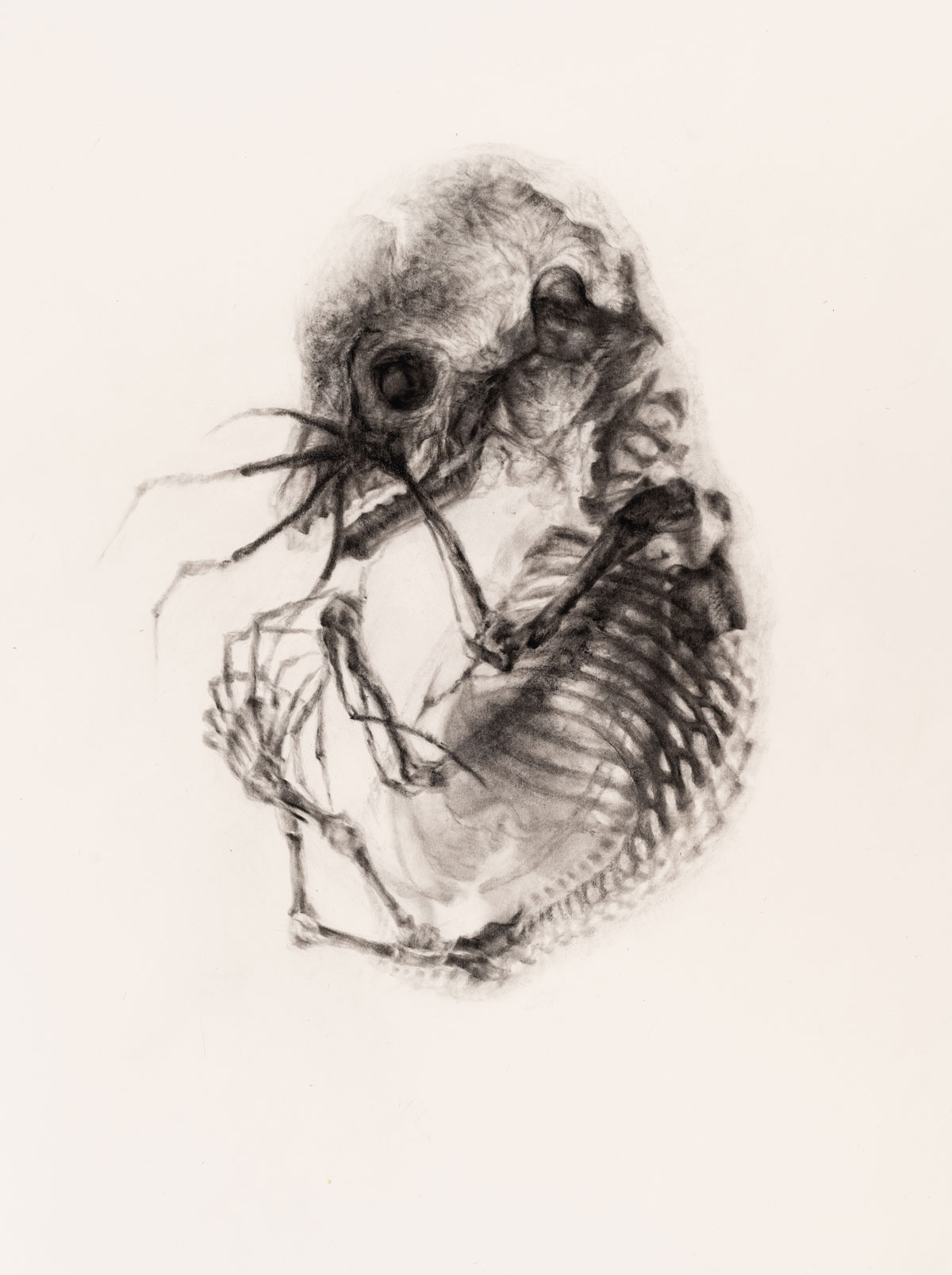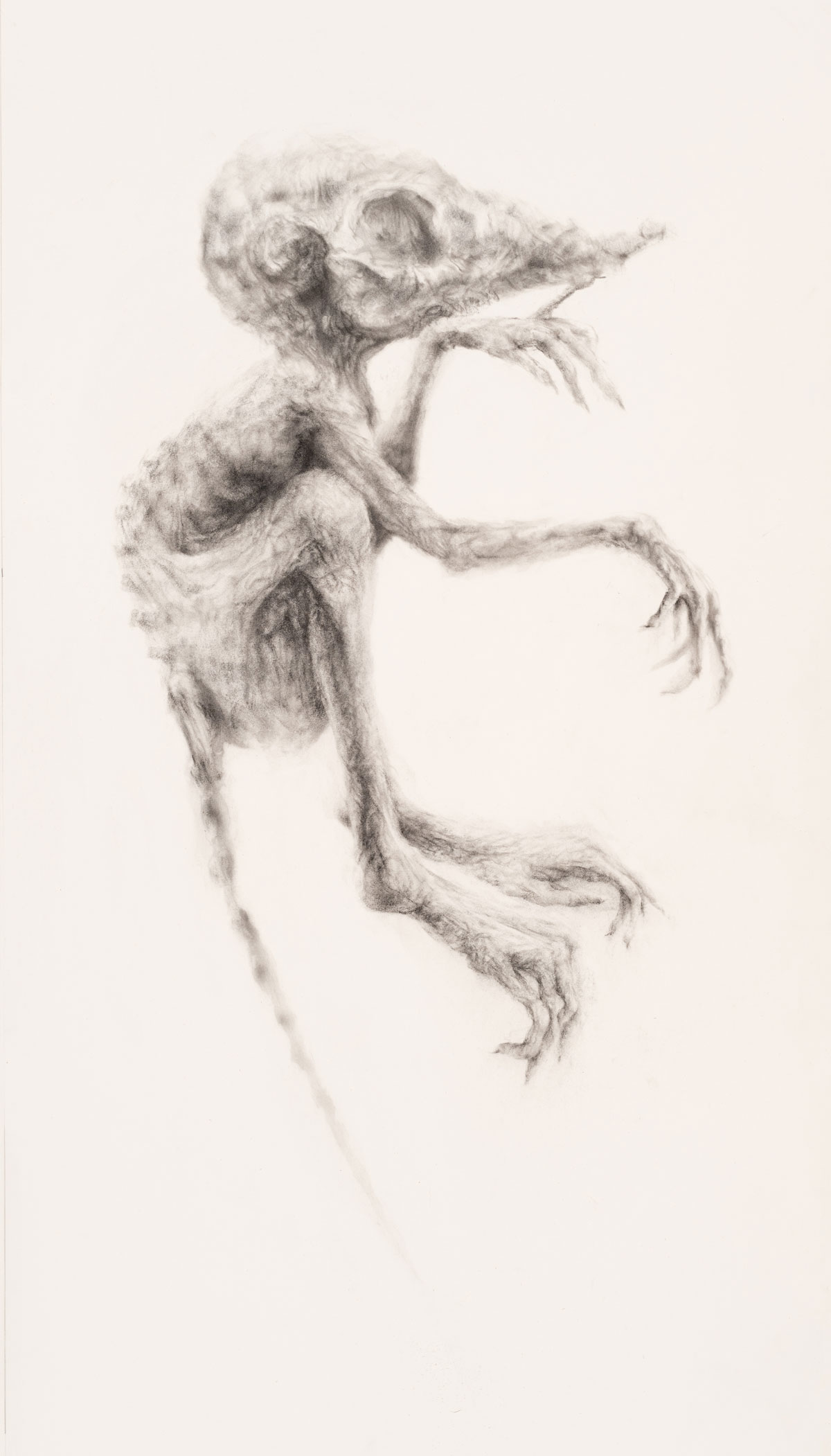 All the animal species in this most recent exhibition will soon be extinct. In figures 1 and 2, the spurned bat, “that, despite its equanimity, finds itself ensconced in the myths and superstitions that our fears have spawned over ages” (Gunter 2022: 6), is drawn with a cuddly warmth that endears and evokes a deep sense of infant vulnerability. By merely looking at the drawing, the viewer feels the tension between skin that is smooth and supple versus bones that are spindly and brittle. The embryonic animal appears to be playing peek-a-boo with a human audience that may well mistake the game and react with violence. Here there is no room for playful error. To mistrust is fatal. In figure 3, poignantly titled it spurns and feigns regard, the skeletal complexity of the bat alienates an uncomprehending viewer. The ominous form seems to confirm our worst suspicions. This animal is indeed weird.