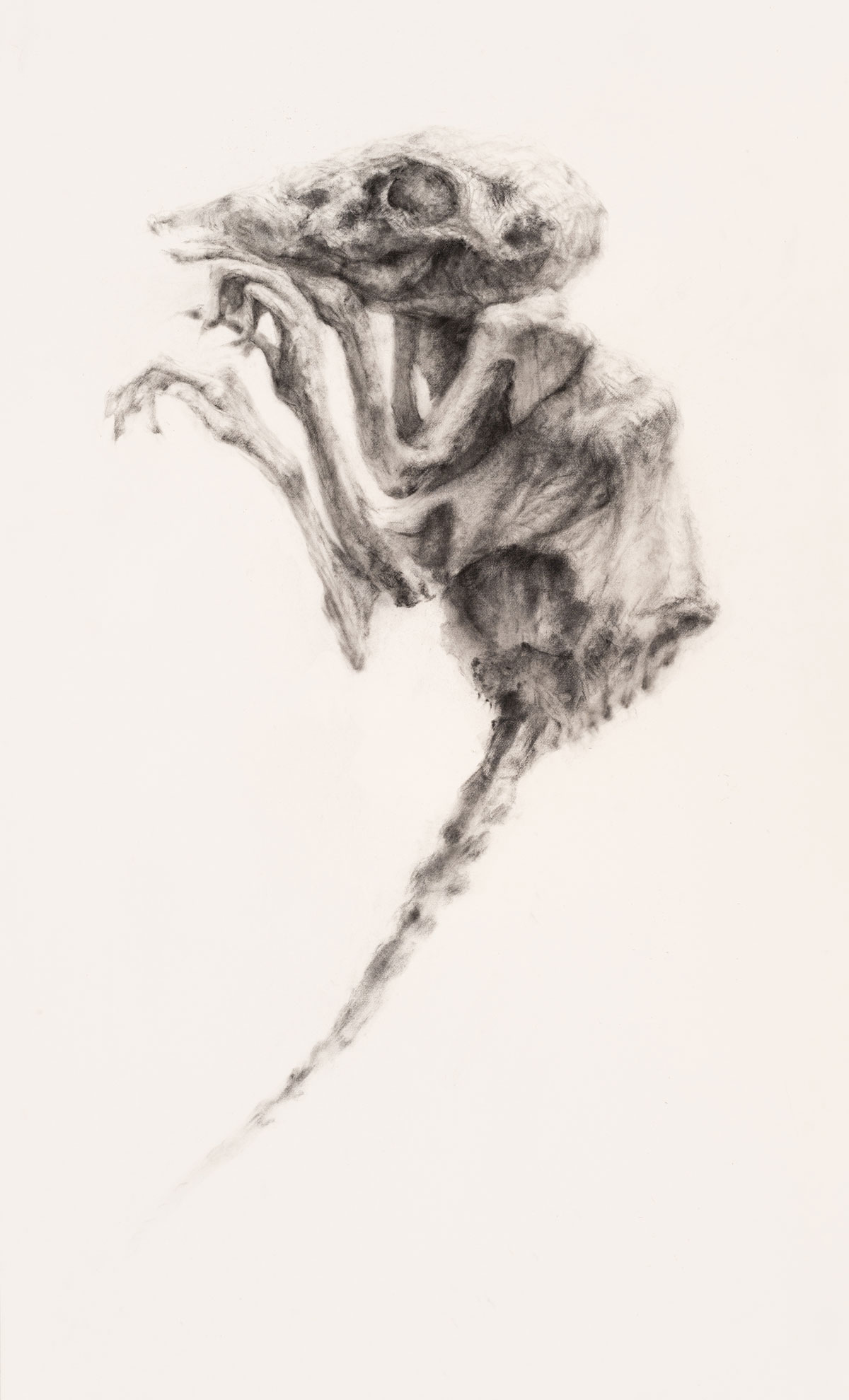 The African sengi (or elephant shrew), seen in figures 4 and 5, is also severely threatened or on the brink of extinction and is also indigenous to Africa. Already odd and eery with legs and snout that are too long, the creature is made creepier by Gunter’s mark-making that enfleshes the small skeletal architecture. The charcoal smudges lovingly, moulds a little body that is nimble in life but frigid in death. Who is this little being and what is its significance to the sensitive ecology of its environment. What will be lost with it?