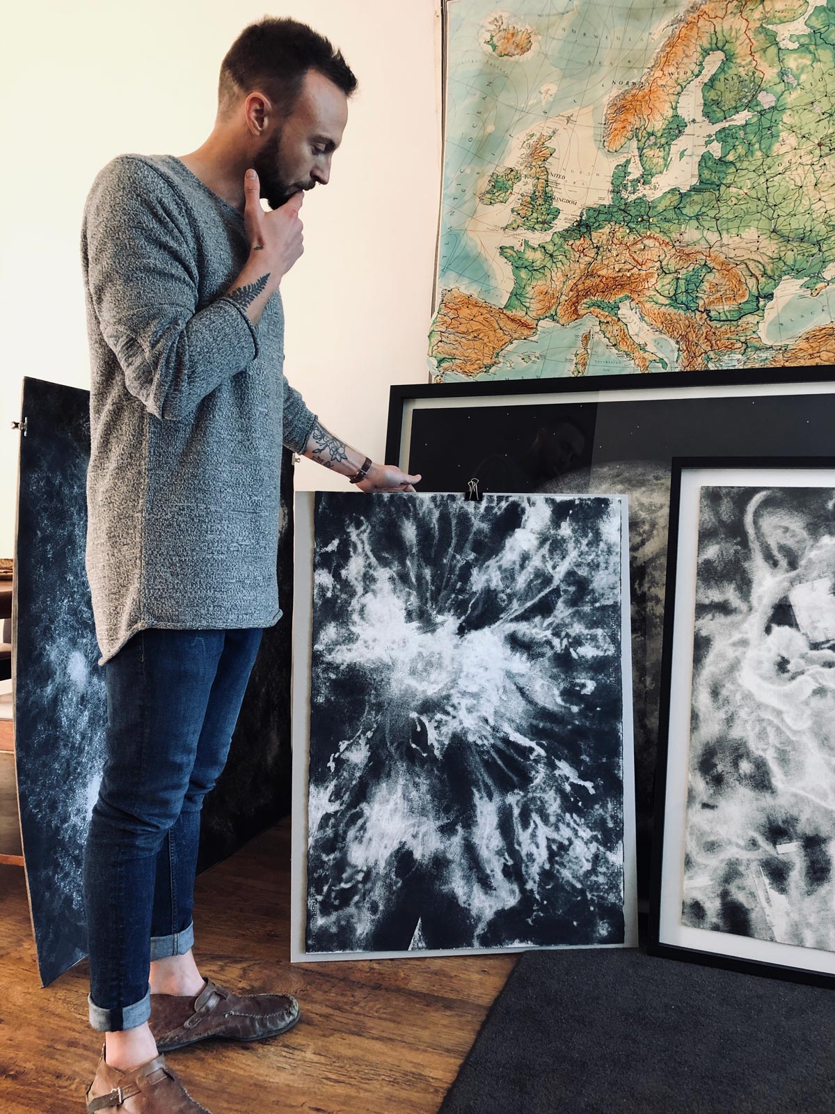 An exhibition of Van der Wal’s work in 2019 included imposing drawings of planets (Figure 1). These monumental entities were drawn in pencil and ink, scratched into the surface of the paper in digital-looking Ben Day dots and obsessive cross-hatching. The spherical (or Delaunesque) orbs were juxtaposed with amorphous, inky constellations that felt like depictions of infinity, the manifestations of epic scale. The solar systems were mimicked by or even superimposed on equally daunting depictions of viruses (Figure 2), specifically the HI virus that continues to haunt queer masculinity with a magnitude that feels prescient as Donald Trump takes office again and initiates a new era of vilification and denial, also for the LGBTQIA+ community. In an interview Van der Wal (2024) says he is intrigued by work done in the field of microscopy, “especially where the intersection of art and science is concerned.” His drawings are based on photographic images that are science-y, but not alienating.