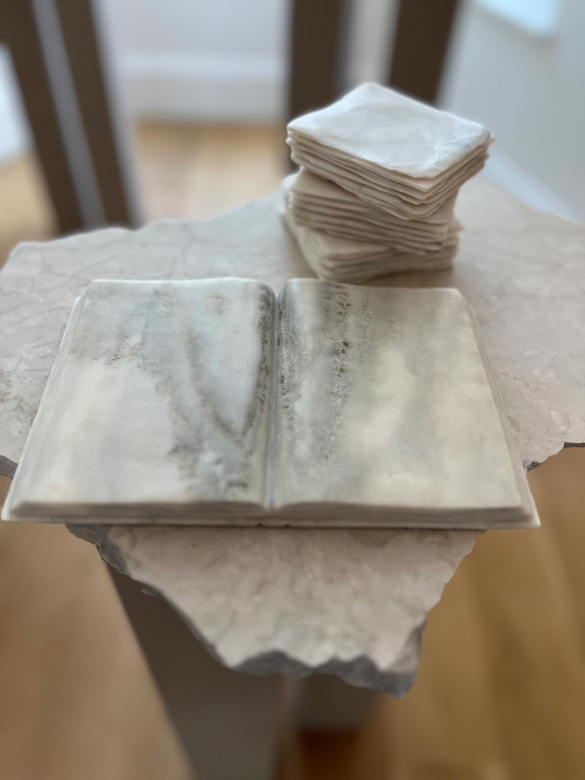 The books Van der Wal sculpts draw on a tradition of commemoration in which small marble books are carved to honour or remember a loved one who has died. The artist is himself struggling with grief and uses the process of sculpting into the soft stone as a means of processing loss. The almost translucent stacks are delicate and vulnerable. They are venerated but in ways that seem to imply that it is the small and subtle that is worthy of attention, not the grandiose. Writing about Greek miniaturisation, Oliver Pilz (2011: 20) points out that the miniature version of an object is often a more effective way of articulating its semiotic meaning, since the miniature usually cannot fulfil the function of the original. In other words, it is purely symbolic, a simulacrum.