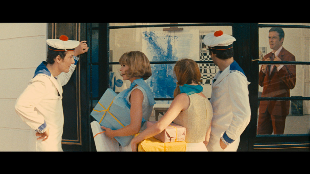 Cet article, j’ai voulu l’écrire en retombant sur cette image du film de Demy, ou Daniel Moquay apparaît, avec ses yeux bleus et la peinture bleue dont il commencera à faire la promotion, un an plus tard. Son nom est noyé parmi ceux des autres figurants, sur le fond bleu du générique de fin ; il est difficile de le rattacher au marin anonyme qui passe devant une vitrine. Certes, je n’apprends rien à personne en disant que les archives sont le lieu de l’identification, nommer les individus, comprendre les événements et les rencontres. Ce qui me frappe a posteriori, ce sont les lacunes de ma pratique de chercheuse débutante : j’avais écarté ce que je considérais comme anecdotique, ou plutôt, ce que je n’avais pas le droit de prendre en compte dans ma réflexion. Cette rencontre hasardeuse sortait du cadre de la préméditation de l’artiste comme du cinéaste. Ce qui m’a poussée au silence sur cette belle anecdote, c’est cette frontière de l’intention contre laquelle nous sommes pourtant tous prévenus au moment de faire de l’analyse de film : répéter l’objectif annoncé par l’auteur n’a pas d’intérêt, reprendre le message apparent de l’œuvre non plus. L’analyse découvre, révèle ce que l’œuvre produit et non ce qu’elle dit. Et pourtant, comment considérer un tel hasard dans l’ensemble signifiant du film ? La présence de Moquay sur le tournage de Demy et devant une toile de Klein relève de l’anecdote.