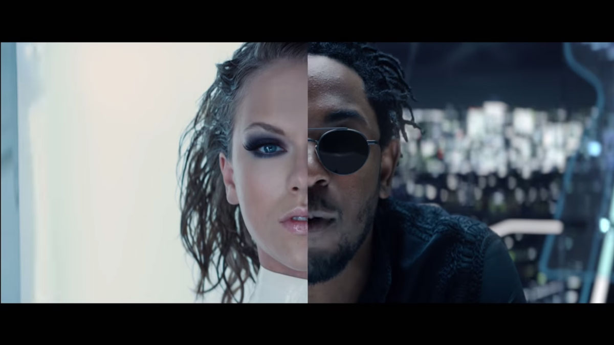 But in the end, it is not Catastrophe who is the ringleader of the clan. It is the only male person in this revenge story, Welvin da Great (or Kendrick Lamar), who is shown power posing in his ivory tower with his feet on his desk. [0:50] As a modern Mars, he seems to issue orders through his microphone. In this way, the images that show half of Taylor Swift’s and half of Kendrick Lamar’s face, frontal or – like the Roman God of transitions Janus – from the side [2:58], aren’t a progressive claim for gender fluidity. They indicate that the ‘empowering’ all-female community is just a violent, pre-modern copy of the patriarchal structures at the office, which are built on hierarchic power relations, fierce competition and strategies of in- and exclusion.