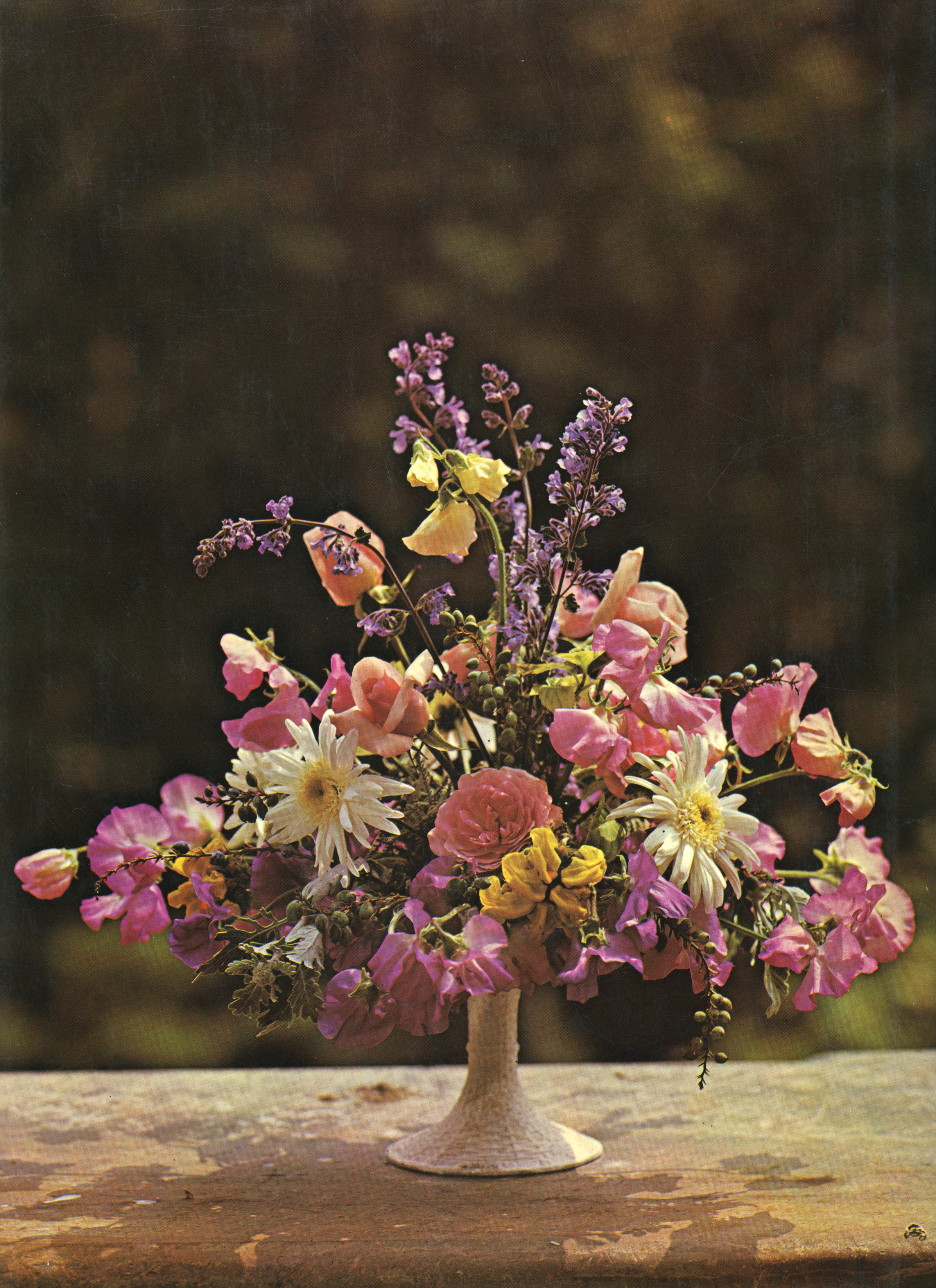 This nicely proportioned fan-shaped arrangement represents the glory of summer. Deep pink roses, hydrangeas, larkspur and gloxinias with rosemary and bronze-coloured foliage, shows how charming a well-executed mass arrangement can look.