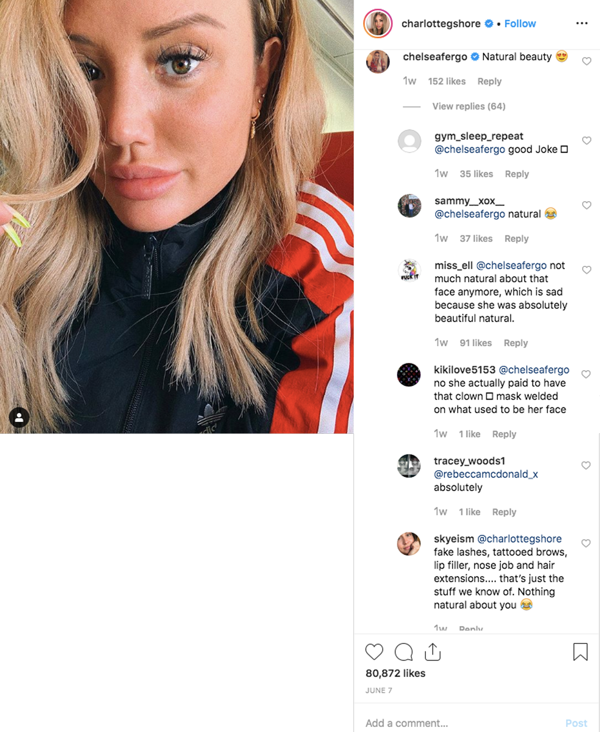 Fans maken zich zorgen om Charlotte Crosby. De Britse realityster heeft de afgelopen jaren verschillende plastische procedures laten uitvoeren. Nu duiken in de tabloids met de regelmaat van de klok dramatische headlines op als “Charlotte Crosby shocks with chiselled nose and swollen face as fans beg, ‘stop the surgery’” (Irish Mirror, 24/04/2019), “Charlotte Crosby’s fans fear she’s addicted to surgery as they beg her to stop having fillers after she shares very pouty pic” (The Sun, 22/03/2018) of “Charlotte Crosby stuns This Morning viewers with ‘plastic face’ as fans beg her to stop having surgery” (Mirror Online, 28/03/2018). De commentaren op Crosby’s Instagram gaan uit van een vanzelfsprekend onderscheid tussen ‘natural beauty’ en een ‘fake’ of ‘plastic’ uiterlijk. Toen een vriendin van Crosby haar onlangs in een commentaar een ‘natural beauty’ noemde, was het hek dan ook van de dam. Een greep uit de reacties: “are you being sarcastic or stupid?”, “everything but natural !!” en “after a lot of jobs in her face... don’t call this natural, sister”. Anderen zeggen simpelweg “LOLLLL” of posten een rijtje emoji’s die huilen van het lachen. Maar wat houdt dit onderscheid tussen natuurlijke schoonheid en ‘fakeness’, dat blijkbaar zo vanzelfsprekend is, precies in? Ook beroemdheden die bekendstaan als ‘natuurlijke’ schoonheden dragen make-up, gebruiken haarproducten, en hebben in sommige gevallen zelfs plastische ingrepen ondergaan, zoals botoxinjecties. De labels ‘natuurlijk’ en ‘fake’ lijken minder te maken te hebben met of iemand al dan niet onder het mes gegaan is, dan met bepaalde, zeer specifieke esthetische kenmerken of visuele betekenaars die we associëren met adjectieven als ‘fake’ en ‘trashy’. Die betekenaars bestaan uiteraard niet in een vacuüm, maar hangen vaak samen met andere factoren zoals sociale klasse.