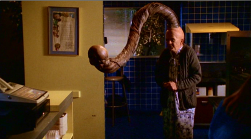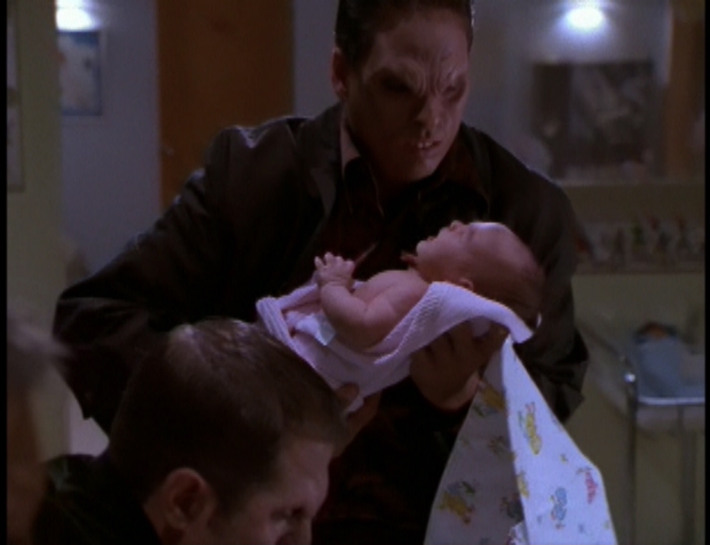 Een gelijkaardig motief duikt in het derde seizoen op in de episode “Band Candy”.19 De antagonist van dit seizoen is Richard Wilkins, oftewel The Mayor, die Sunnydale oprichtte in 1841 en sindsdien via allerlei deals met demonen niet alleen eeuwig jong blijft, maar bovendien nooit een verkiezing verliest. De keerzijde van zijn generaties lange greep op de macht is dat hij aan al deze demonen op gezette tijden bepaalde offers moet brengen. “You see, that’s what separates me from other politicians”, zegt hij hierover. “I keep my campaign promises.” Een van de demonen aan wie hij bepaalde beloftes gemaakt heeft is Lurconis, alweer een gigantische slang die zich ophoudt in de riolen onder Sunnydale. Na een onrustwekkende verdwijning van borelingen uit de kraamafdeling van het ziekenhuis ontdekt Buffy dat Lurconis iedere dertig jaar uitbetaald wordt met een lading levende pasgeboren baby’s, die ritueel aan hem gevoederd dienen te worden.