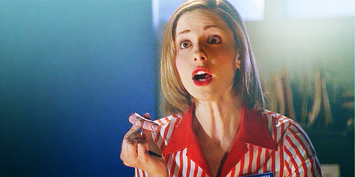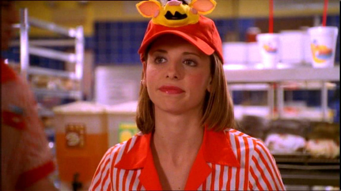 Naarmate de serie vordert, worden de thema’s duisterder. In het vijfde seizoen sterft Buffy’s alleenstaande moeder, en aan het einde van dat seizoen sterft Buffy zelf. Wanneer haar vrienden haar in de eerste aflevering van het zesde seizoen terughalen uit de dood, blijken de schulden zich tijdens haar afwezigheid te hebben opgestapeld. In plaats van terug te keren naar de universiteit neemt ze een McJob aan in de hamburgertent Doublemeat Palace.23 Tijdens de lange werkuren in deze troosteloze neonverlichte omgeving gaat Buffy zich al snel vragen stellen bij het geheime ingrediënt van de burgers, zeker nadat een collega op mysterieuze wijze verdwijnt. Wanneer ze in de vleesmolen een vinger aantreft, barst de sowieso al zwaar depressieve Buffy in het midden van het restaurant uit: “Stop! Stop! Everybody, you have to stop! Stop eating. No, you can’t eat it! It’s not beef. It’s people! The Doublemeat Medley is people!” Ze wordt op staande voet ontslagen.