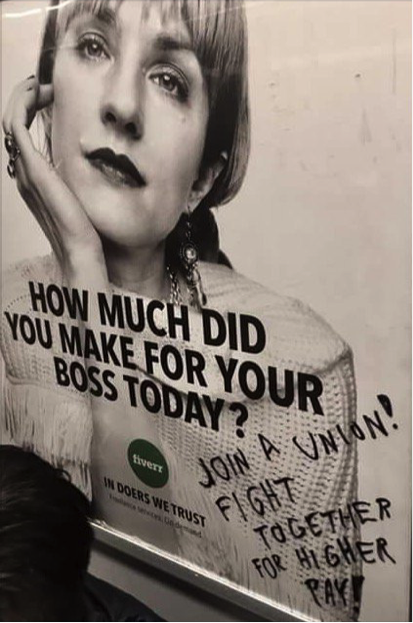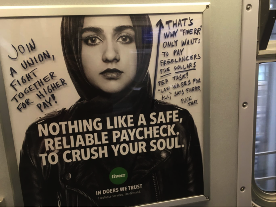Zoals de graffiti op de Fiverr-affiches ons aanmaant: “Join a union, fight together for higher pay!”