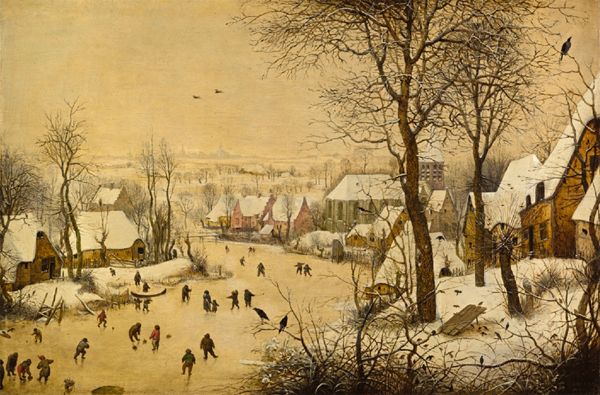 To be sure, Winter Landscape(s) resonates with symbols: Birds are traditional figures of the soul and they must avoid easy temptations (like seeds scattered on the ground) or they will fall into traps set by the devil; townspeople interact in ways that cannot not reflect on moralizing proverbs that condition other works by Bruegel (father and son) and their contemporaries: life is precarious like ice and even the most sturdy may slip; and so on. Such resonances – I use this term because the symbolic in this work seems to me to bear a kind of sonic reverberation – do not undercut or foreclose the possibility that one might peer into this little world – from the perspective of a cliffside above –as a document about daily life and weather or climate or both, to the degree that they have become intertwined today. Today, scientists warn against identifying any particular event with climate change while they are more comfortable with longer term patterns (or the likelihood of a particular event occurring given higher concentrations of atmospheric carbon dioxide). And of course, they are right. Yet, when we view Winter Landscape today, in the time of climate change, we have to confront our sense of (art) history with a set of terms like “deep time,” “accelerationism,” and of course, “Anthropocene,” which mark our difference from the sixteenth century.