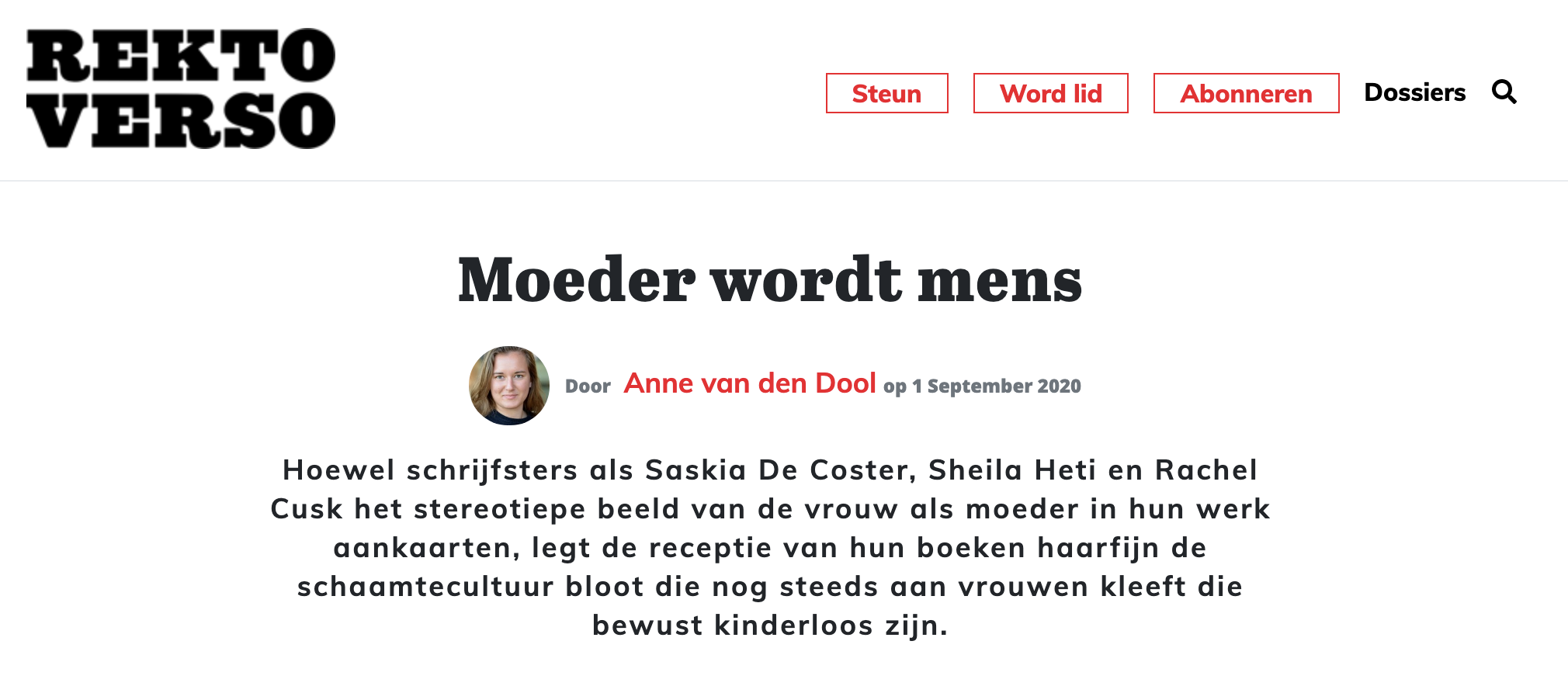 In rekto:verso (1 september 2020) klaagt Anne Van den Dool de schaamtecultuur aan rond bewuste kinderloosheid en twijfels of spijt over moederschap. Ze verwijst naar het recente werk van drie auteurs: Sheila Heti, die in Moederschap haar eigen kinderloosheid probeert te verantwoorden; Rachel Cusk, die de shock van het moederschap beschrijft in A Life’s Work; en Saskia De Coster, die moederschap en schrijverschap moeilijk kan verzoenen in Nachtouders. De werken konden op negatieve reacties rekenen, en het artikel noemt die schaamtecultuur dan ook een taboe, maar is dat wel zo? Er zijn heel wat recente series (Kinderwens, Motherland…) en opiniestukken (Linde Merckpoel in De Standaard, 10 augustus 2020) met dezelfde boodschap. Het thema verhit de gemoederen, maar wordt wel besproken. Waar veel minder over wordt gepraat – en wat misschien een groter taboe is – is dat moederschap waardevol is.