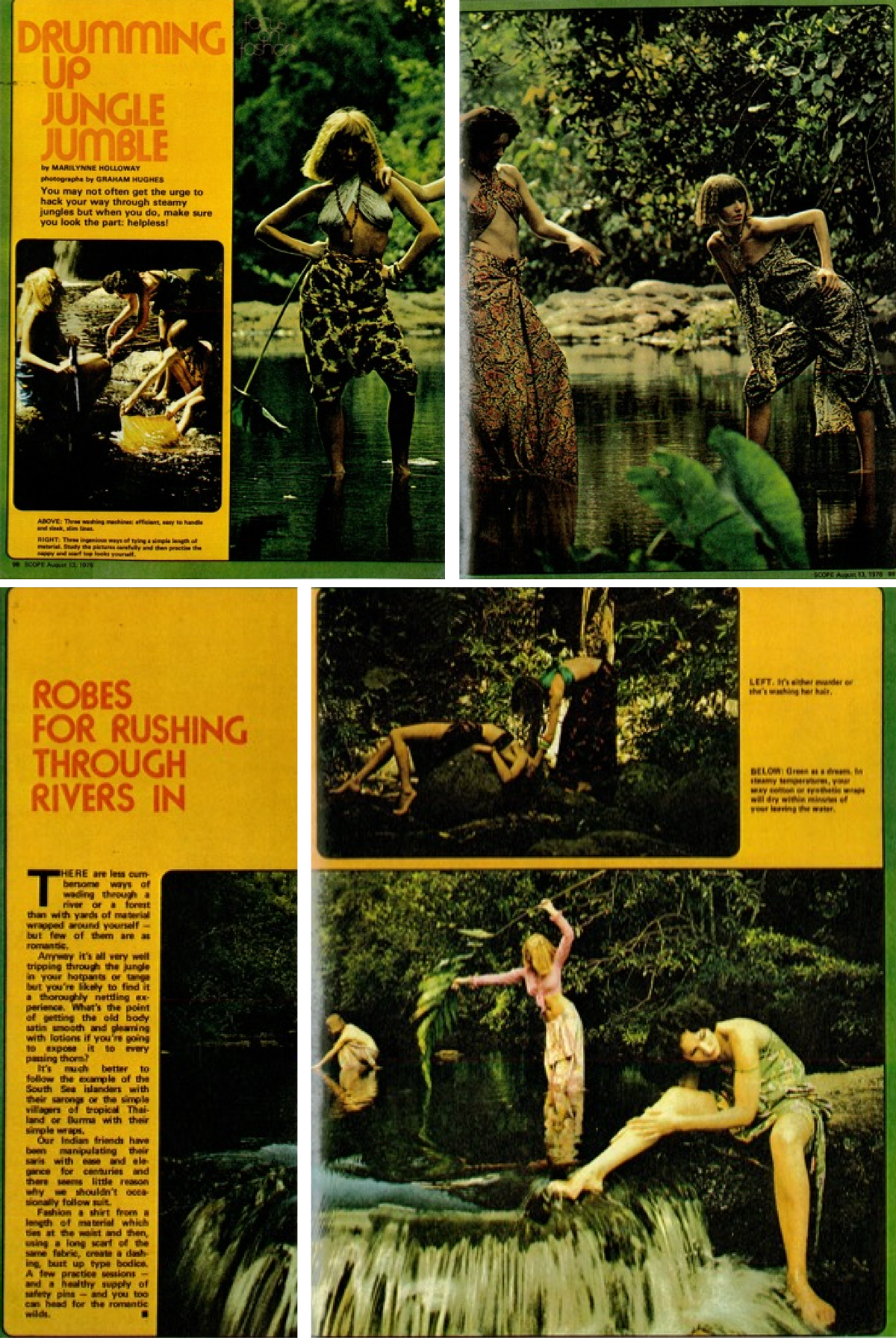 “Drumming up jungle jumble” is a photographic shoot written by Marilynne Holloway and photographed by Graham Hughes that was published in the 13 August 1976 issue of SCOPE. The teaser beneath the title reads: “You may not often get the urge to hack your way through steamy jungles but when you do, make sure you look the part: helpless!” (1976: 98). The brief article explains that once readers have gotten “the old body satin smooth and gleaming with lotions” there is no point in exposing it to “every passing thorn… It is much better to follow the example of the South Sea islanders with their sarongs or the simple villagers of tropical Thailand or Burma with their simple wraps” (1976: 100).